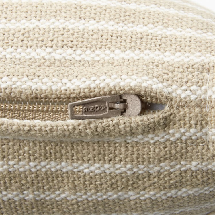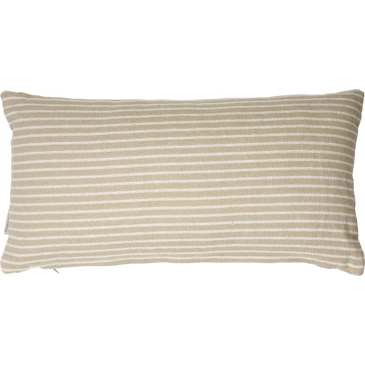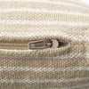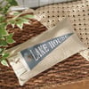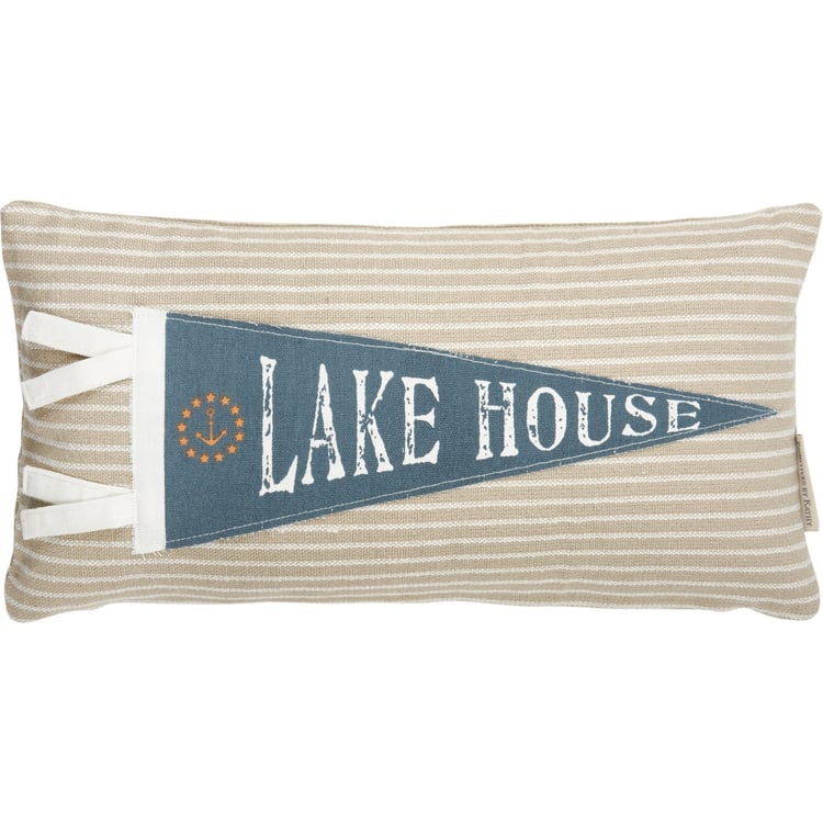 A woven cotton pillow from our Lake & Cabin Collection displaying cream and tan stripes with a canvas pennant stitched on the front. Pennant displays lake blue color with "Lake House" sentiment in distressed style. Pillow features a zipper to easily remove and clean cover. Our Lake House pillow contains polyester filling and is shipped vacuum-sealed for protection and storage. A rustic everyday home accent perfect for an outdoor theme.