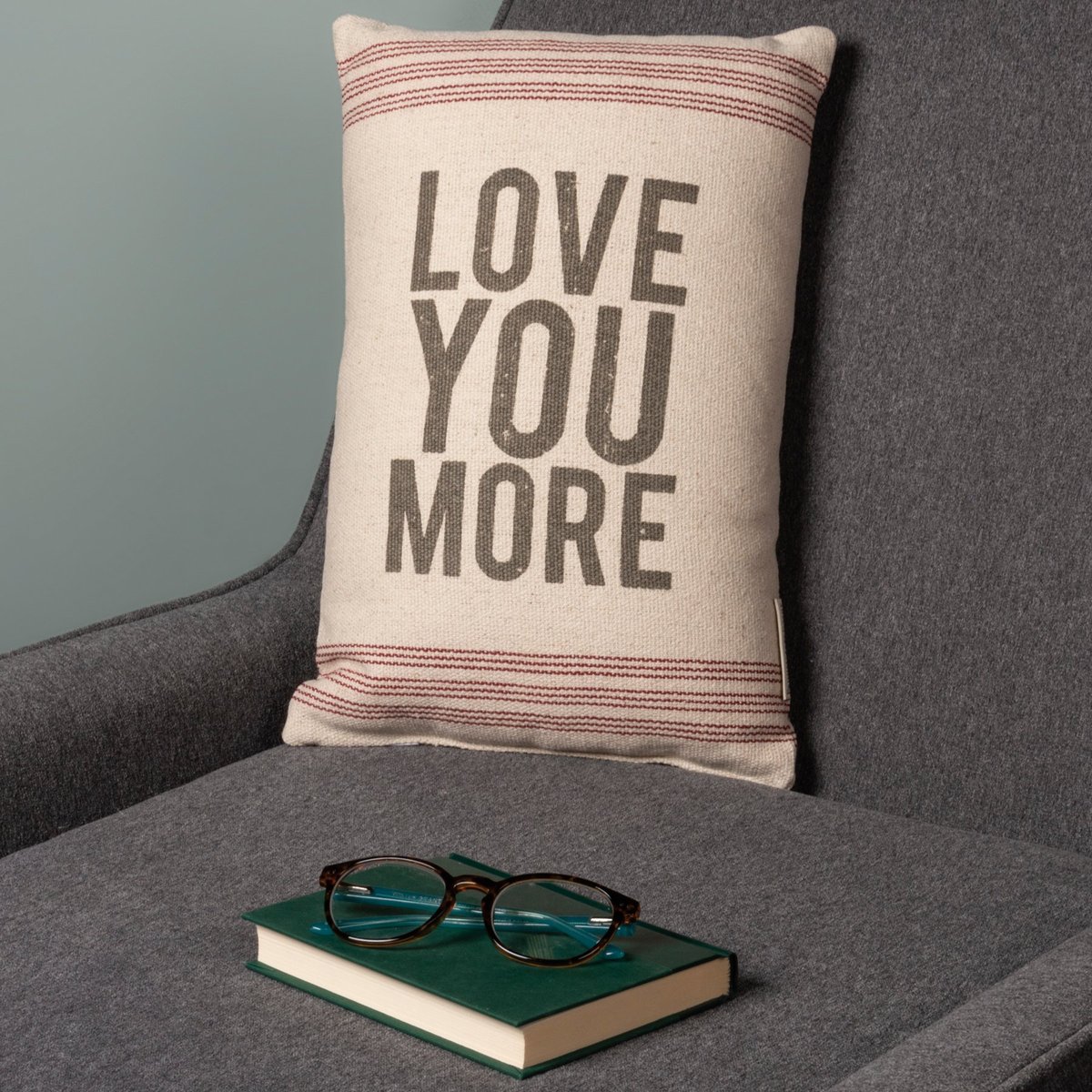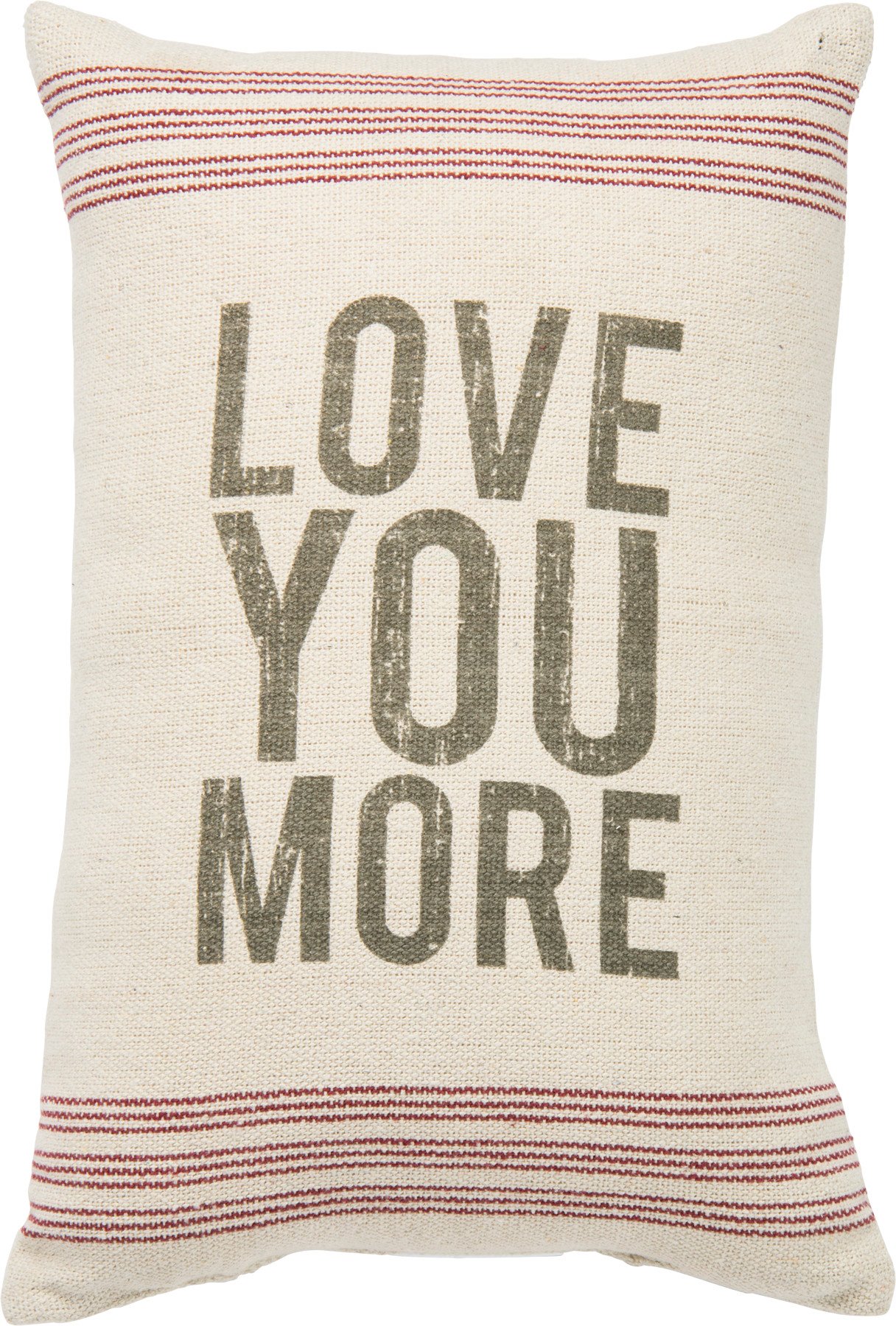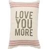 A cotton and polyester pillow from our Word Art Linens Collection features a distressed "Love You More" sentiment with striped trim designs. The Love You More pillow complements well with coordinating pieces in collection or existing decor. Shipped vacuum-sealed for protection and storage.