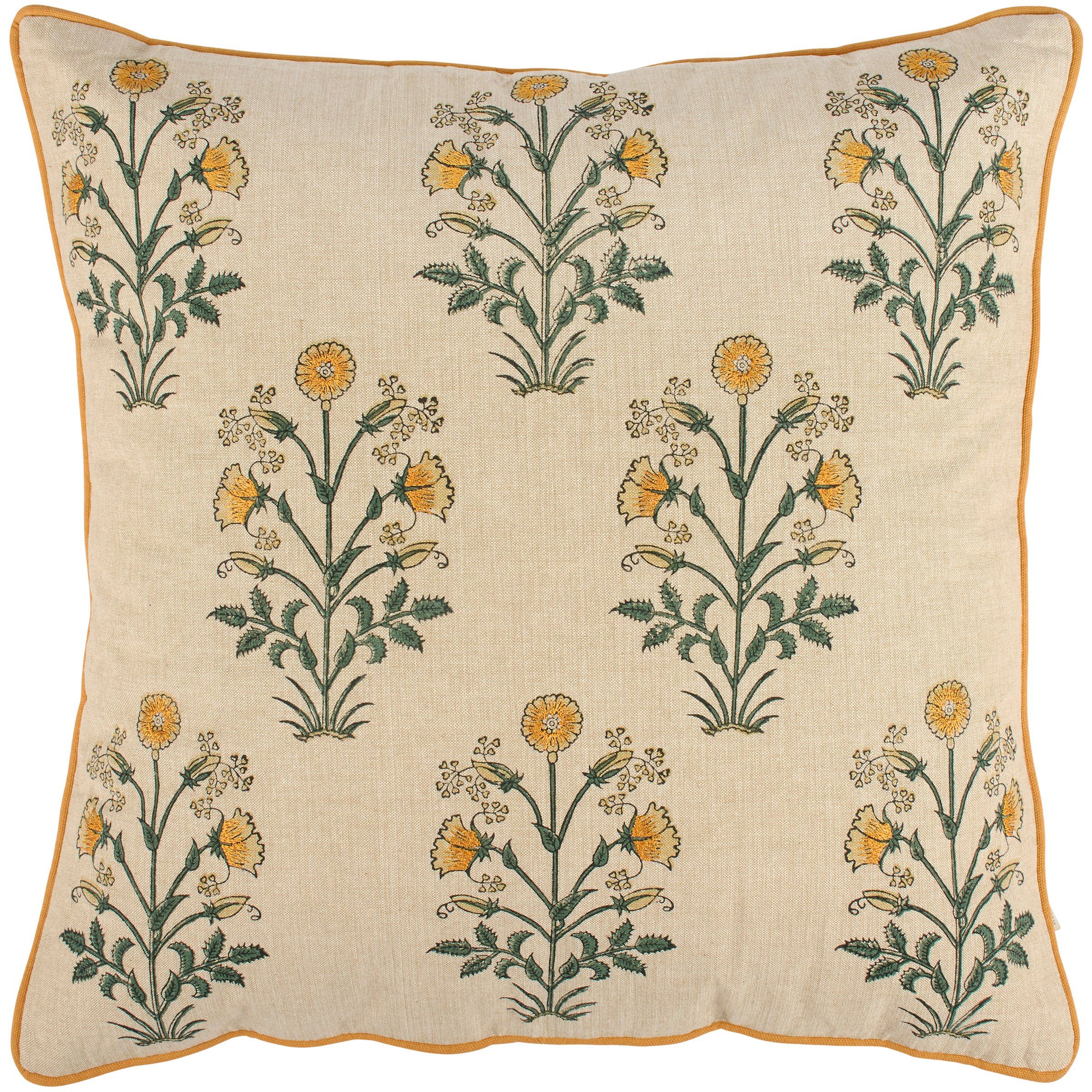 A decorative pillow from our Cottagecore Collection featuring a vintage pattern of marigolds with embroidered details for added texture. Our Marigolds pillow features a zipper to easily remove and clean machine-washable pillow cover. Cottage pillow contains polyester filling and is shipped vacuum-sealed for protection and storage. A rustic home accent perfect for adding cottage style to any room.