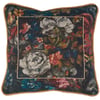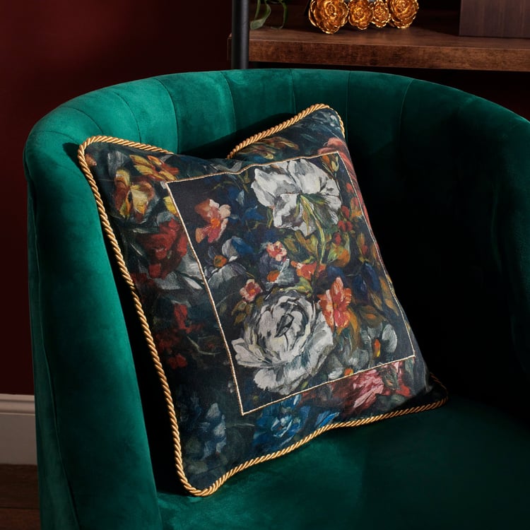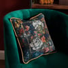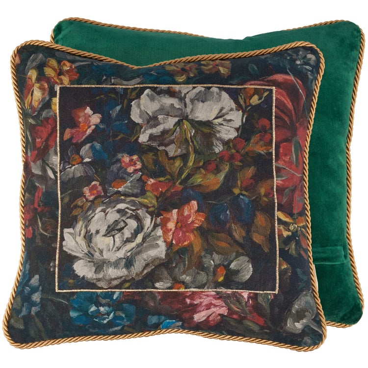 A decorative cotton pillow from our Moody Collection displaying a hand pained design of florals in a deep color palette replicated from original art hand painted in a unique watercolor style. Pillow features coordinating green velvet on back with rope trim and an embroidered square on the front using gold metallic tread. Our Moody Floral pillow includes a zipper to easily remove and clean machine-washable pillow cover. Contains polyester filling and is shipped vacuum-sealed for protection and storage. A stylish everyday home accent perfect for any room.