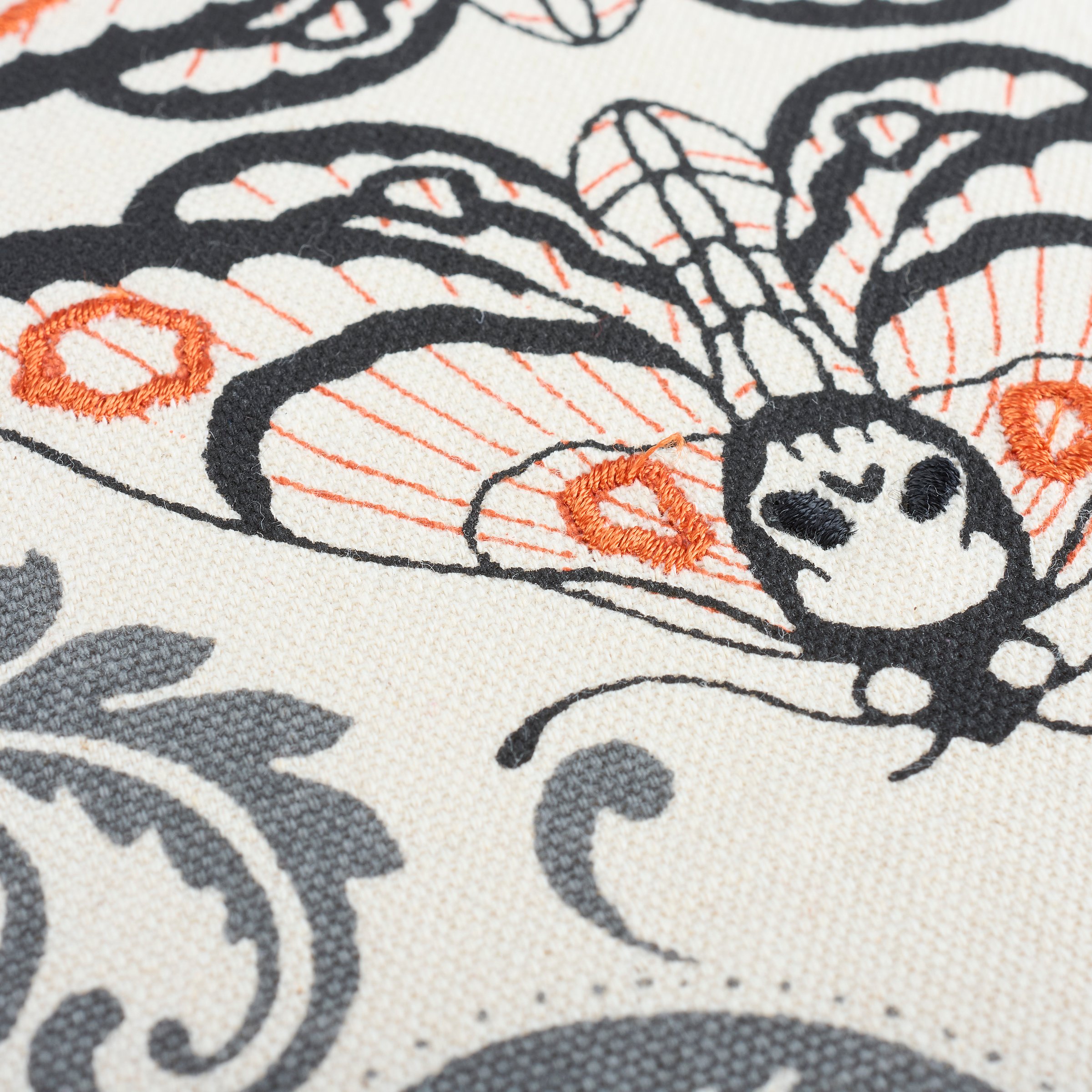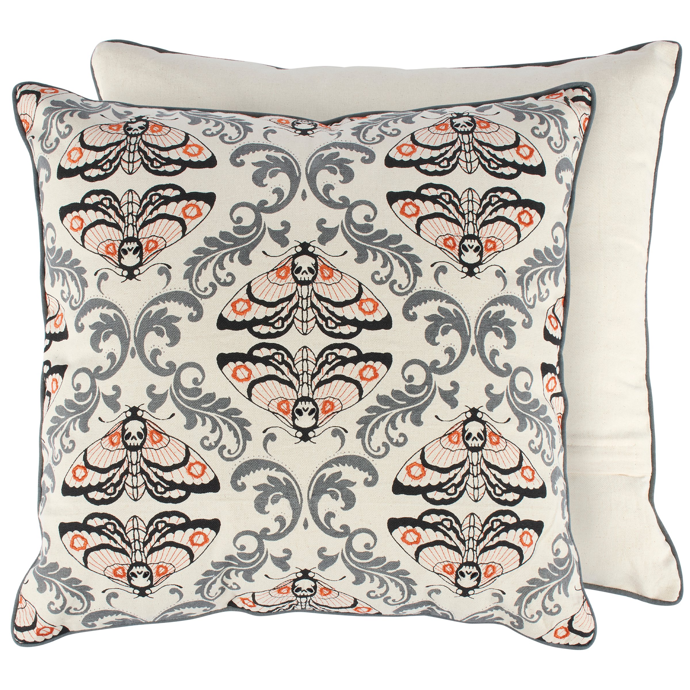 A decorative pillow from our Halloween Collection displaying an ornate pattern of moths with skulls in the design as well as embroidered accents for added texture. Moth pillow features a coordinating gray piping trim. Our Moth Skull pillow features a zipper to easily remove and clean the machine-washable pillow cover. Halloween pillow contains polyester filling and is shipped vacuum-sealed for protection and storage. A Halloween home accent perfect for adding seasonal style to any room.