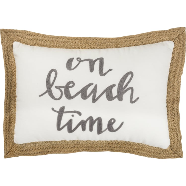A pillow from our Beach Collection lending a hand-guided flat chain stitched "On Beach Time" hand lettered sentiment and braided jute rope trim. This On Beach Time pillow complements well with coordinating design pieces for a great gift set or decor collection. Shipped vacuum sealed for protection and storage.