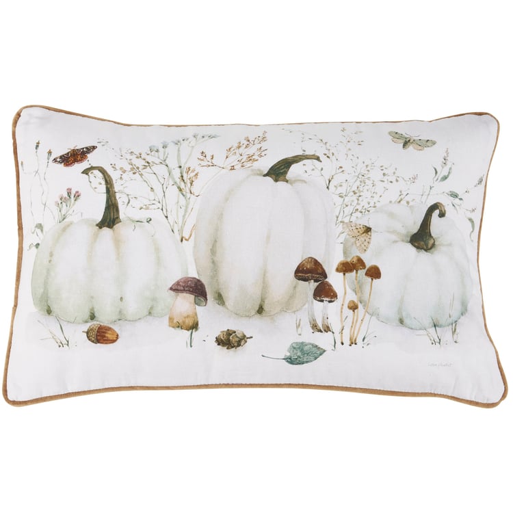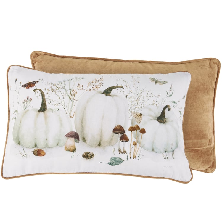 A decorative cotton throw pillow from our Fall & Harvest Collection displaying white pumpkins and fall foliage. Design is replicated from original art hand painted in a delicate watercolor style. Seasonal pillow features coordinating brown velvet on back and piping along the edge. Our Pumpkins pillow includes a zipper to easily remove and clean machine-washable pillow cover. Pillow contains polyester filling and is shipped vacuum-sealed for protection and storage. A fall-themed home accent perfect for adding seasonal style to any room.