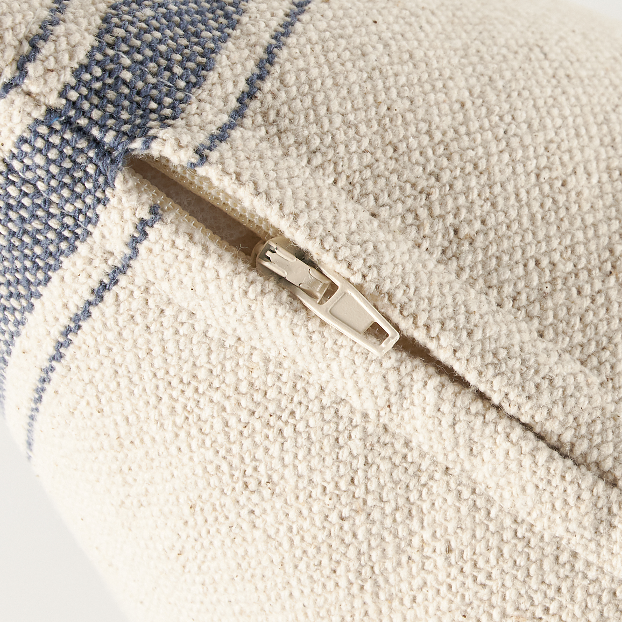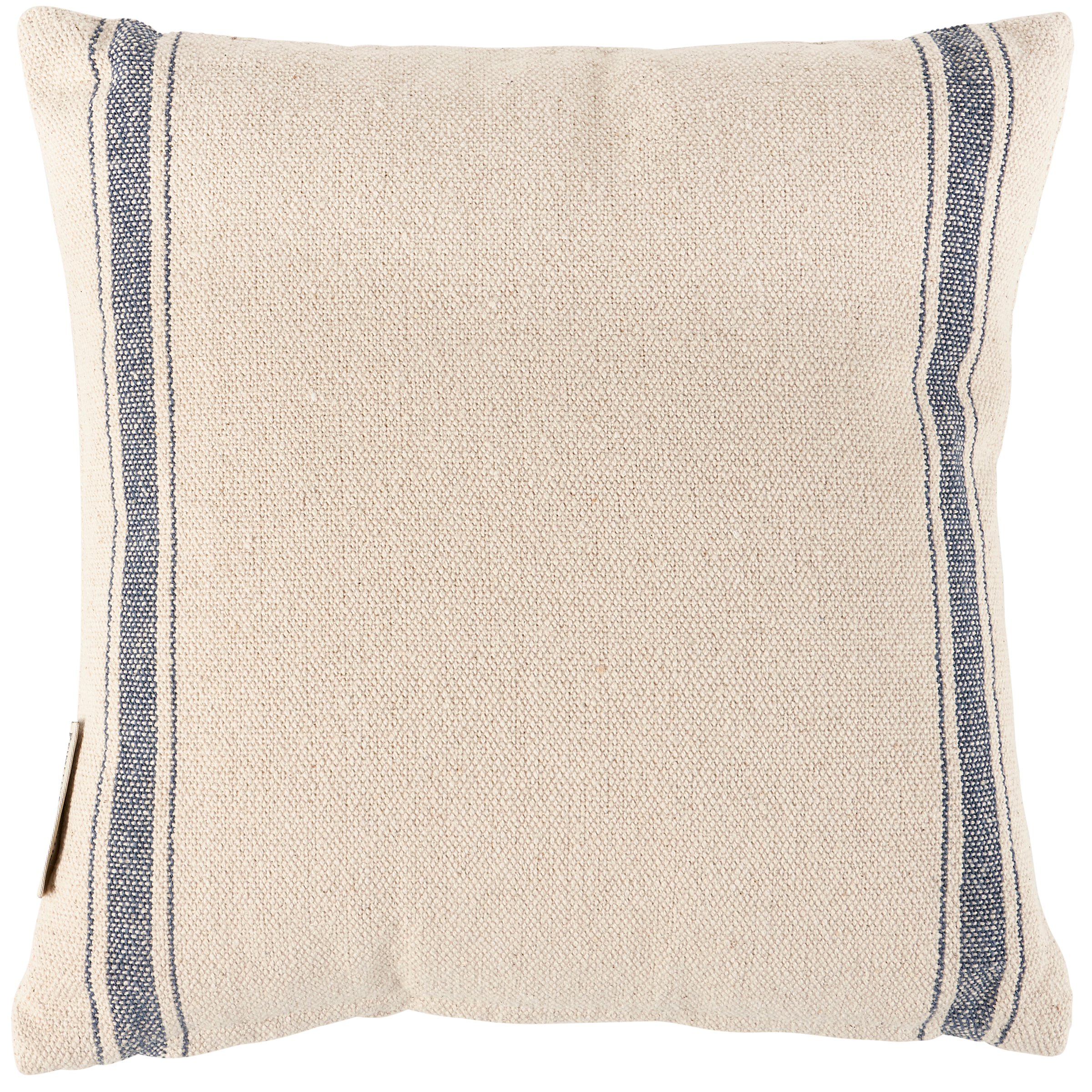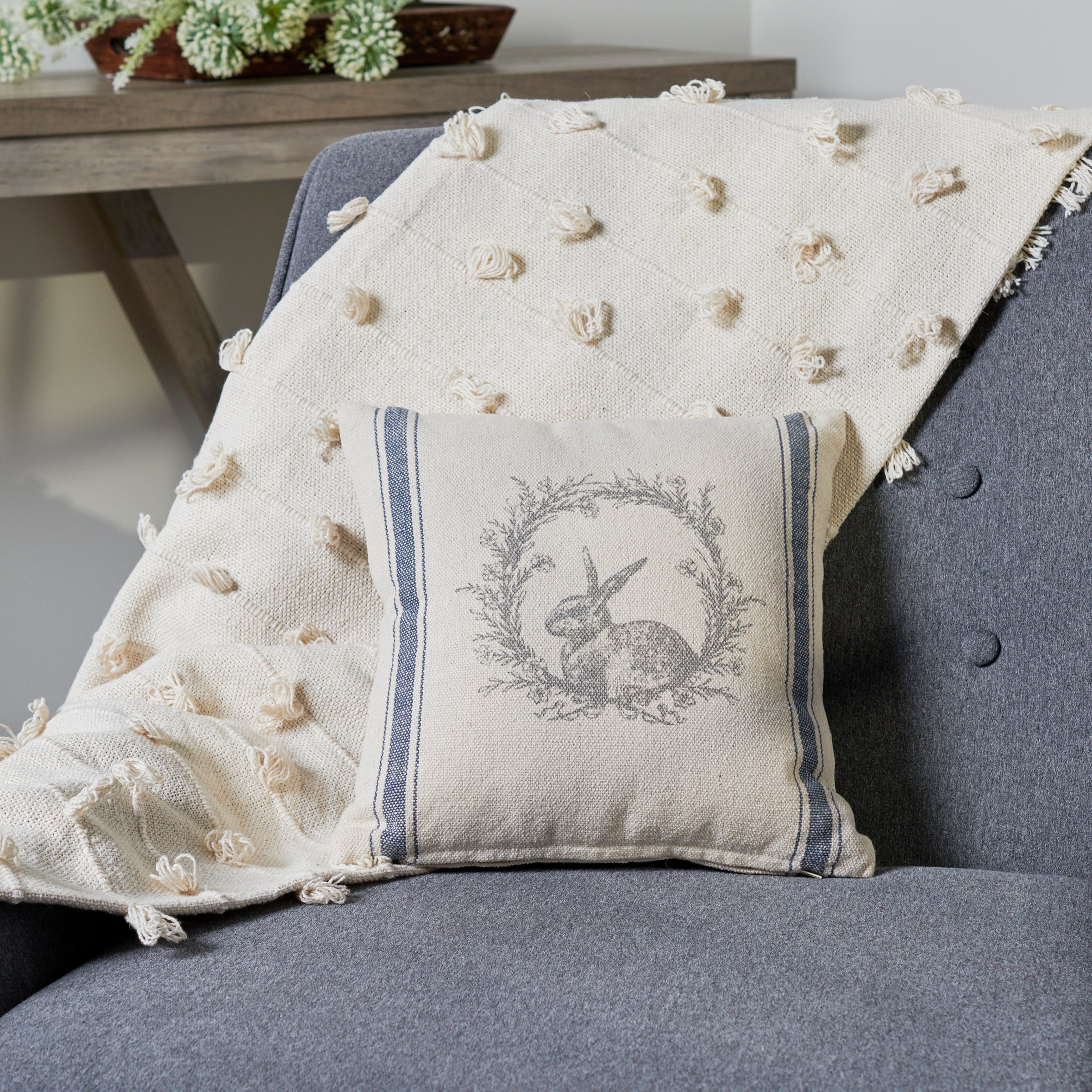 A decorative cotton pillow from our Easter & Spring Collection displaying a vintage style design of a rabbit laying in a floral wreath with blue stripes woven along each side. Pillow features woven blue stripes on back. Our Wreath Rabbit pillow includes a zipper to easily remove and clean machine-washable pillow cover. Pillow contains polyester filling and is shipped vacuum-sealed for protection and storage. The Wreath Rabbit pillow is a vintage seasonal home accent that coordinates with a variety of décor.