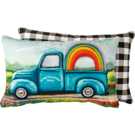 A double-sided cotton pillow featuring a whimsical design of a truck hauling a rainbow on the front. Design is replicated from original artwork painted onto burlap canvas, giving the art a unique depth and texture. Back features black and white buffalo check pattern. Includes zipper to easily remove and clean cover. Polyester filling. Shipped vacuum-sealed for protection and storage.