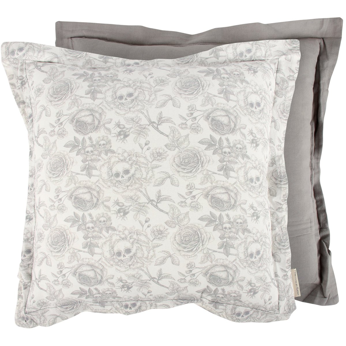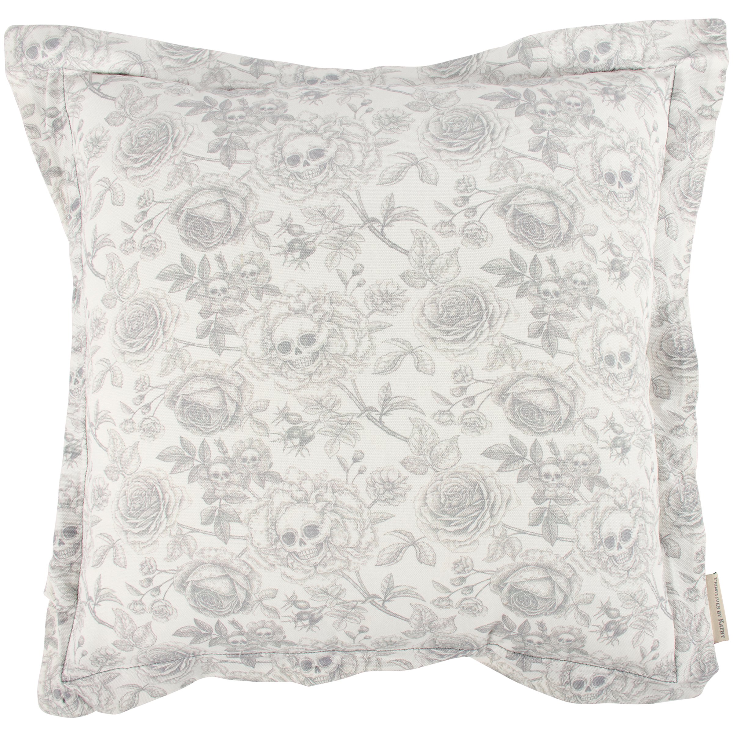 A cotton decorative pillow from our Haunted White Collection displaying a spooky monochrome pattern of skull flowers and roses in a hand illustrated style. Skull pillow features a coordinating gray color on the back and a flange trim Our Rose Skull Flower pillow includes a zipper to easily remove and clean machine-washable pillow cover. Halloween pillow contains polyester filling and is shipped vacuum-sealed for protection and storage. A neutral Halloween home accent perfect for adding seasonal style to any room.