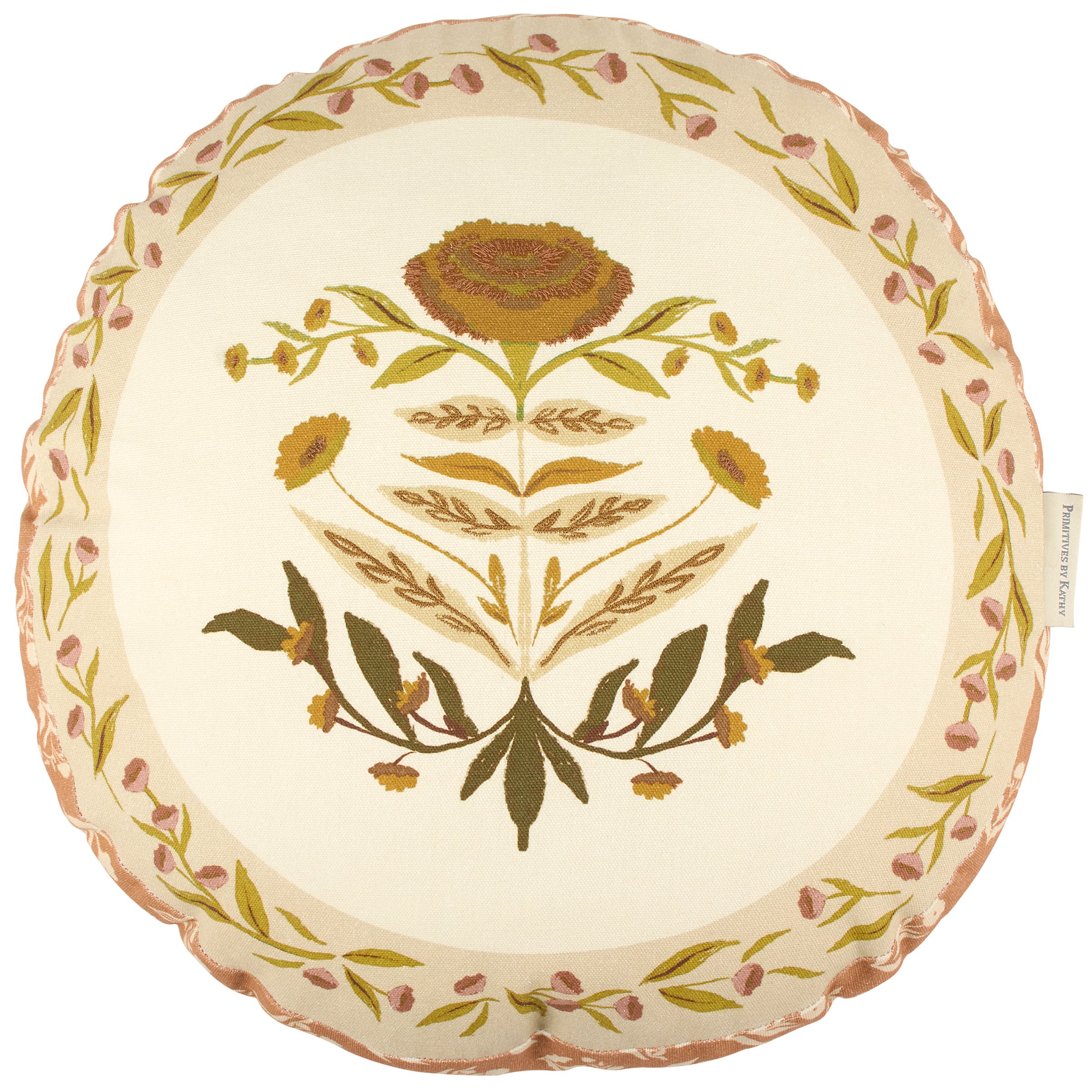 A decorative pillow from our Fall & Harvest Collection featuring a round shape displaying a folk art inspired fall floral design with embroidered details for added texture. Our Round Fall Folk Floral pillow features a zipper to easily remove and clean machine-washable pillow cover. Seasonal pillow contains polyester filling and is shipped vacuum-sealed for protection and storage. A folk art home accent perfect for adding fall style to any room.