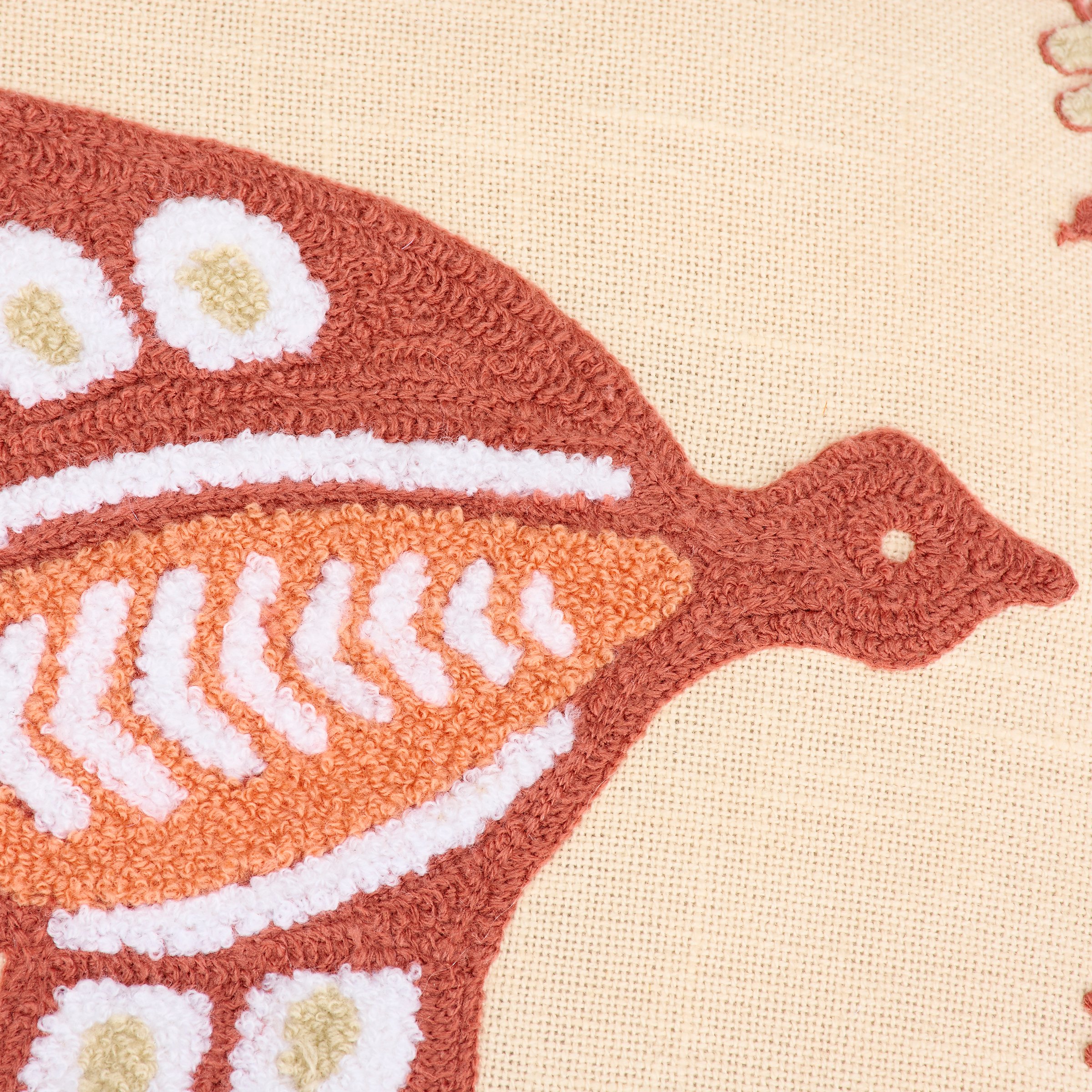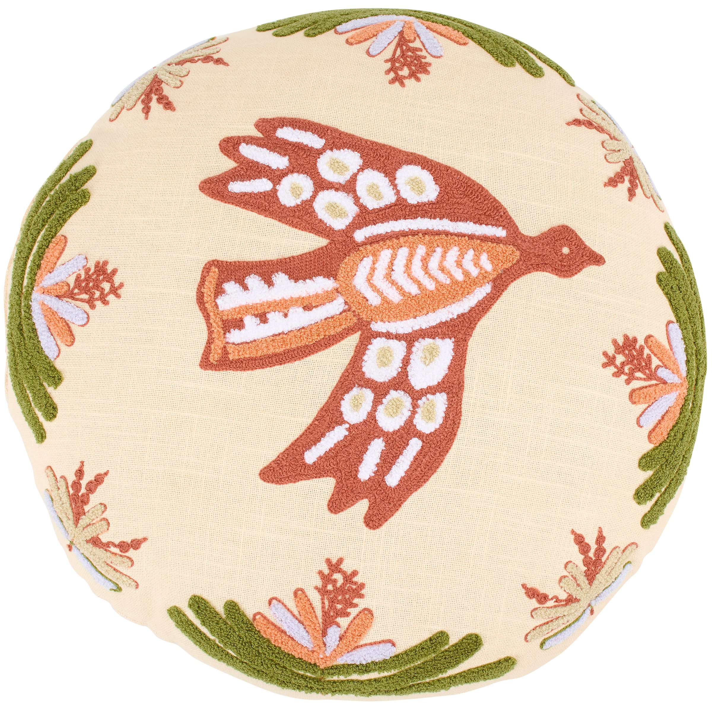 A decorative pillow from our Fall & Harvest Collection featuring a round shape displaying a folk art inspired design of a bird and fall florals in a hand-hooked style with embroidered details for added texture. Our Round Folk Art Bird pillow contains polyester filling and is shipped vacuum-sealed for protection and storage. A folk art home accent perfect for adding fall style to any room.