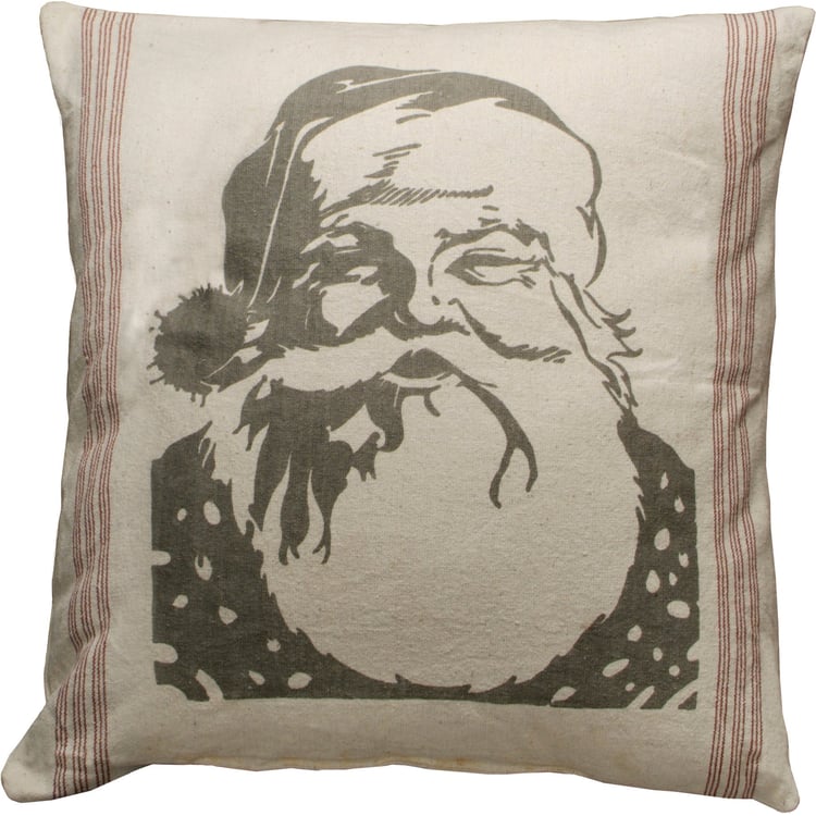 A cotton and polyester pillow featuring a distressed Santa Claus design with striped trim accents. Polyester filling. Includes a zipper to easily remove and clean cover. Shipped vacuum-sealed for protection and storage.