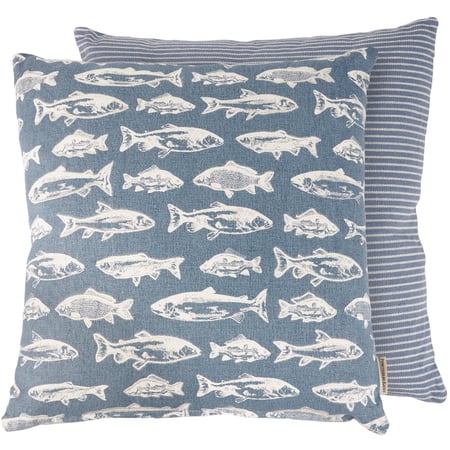 A cotton pillow from our Lake & Cabin Collection displaying a rustic school of fish pattern in a lake blue color palette with embroidered details. Fish pillow feature coordinating blue stripe pattern on the back. Rustic pillow includes a zipper to easily remove and clean machine-washable pillow cover. Our School Of Fish pillow contains polyester filling and is shipped vacuum-sealed for protection and storage. A rustic home accent perfect for adding style to any cabin or RV.