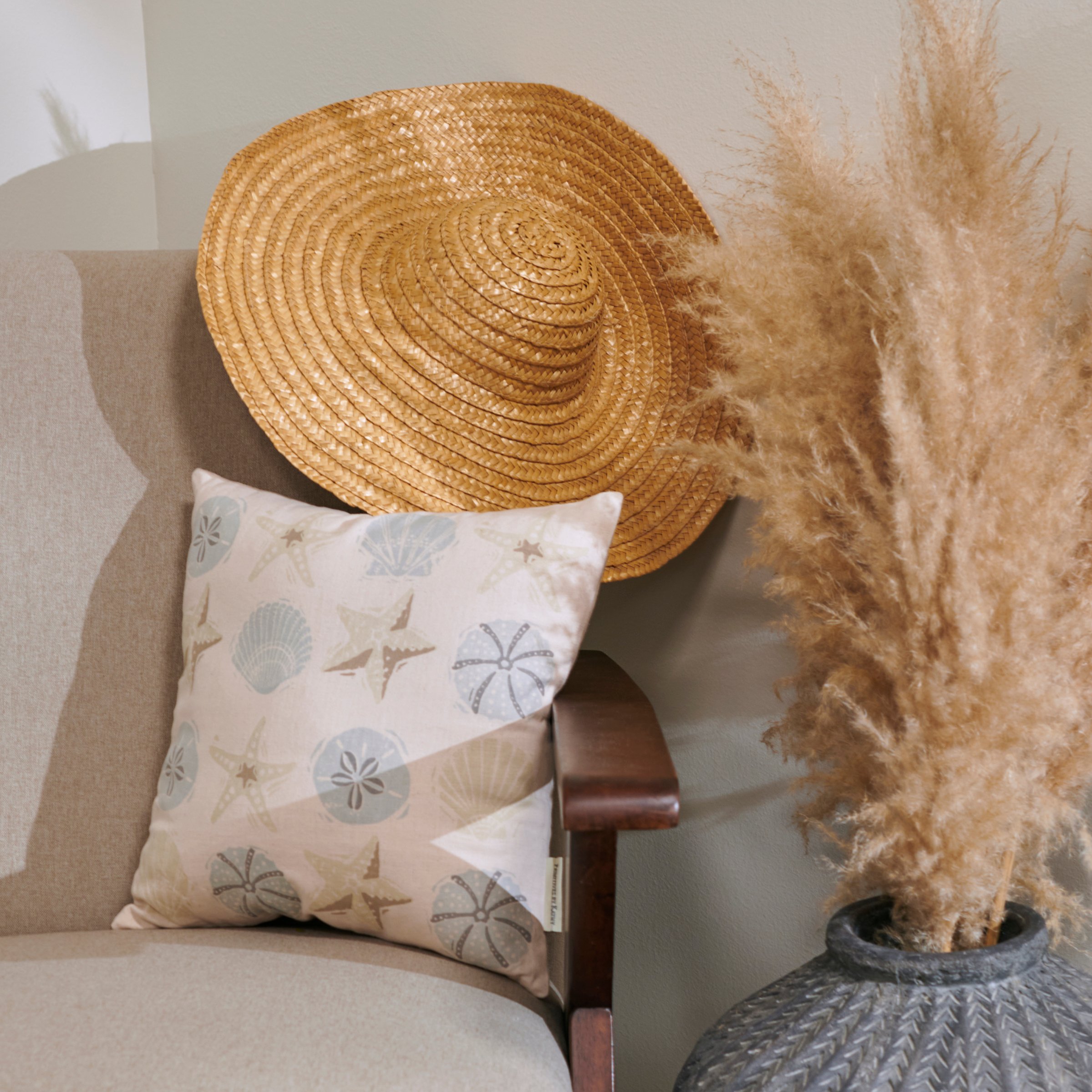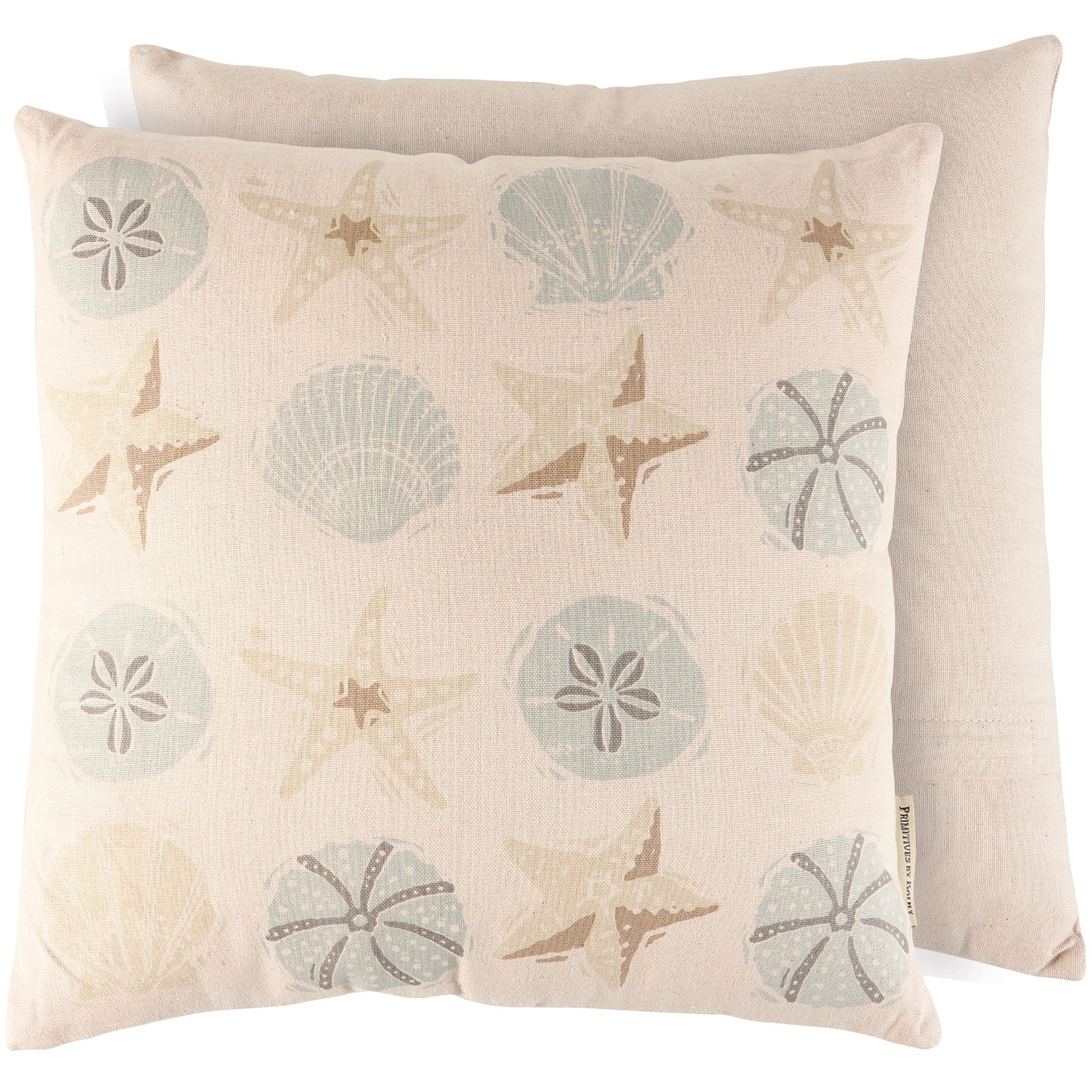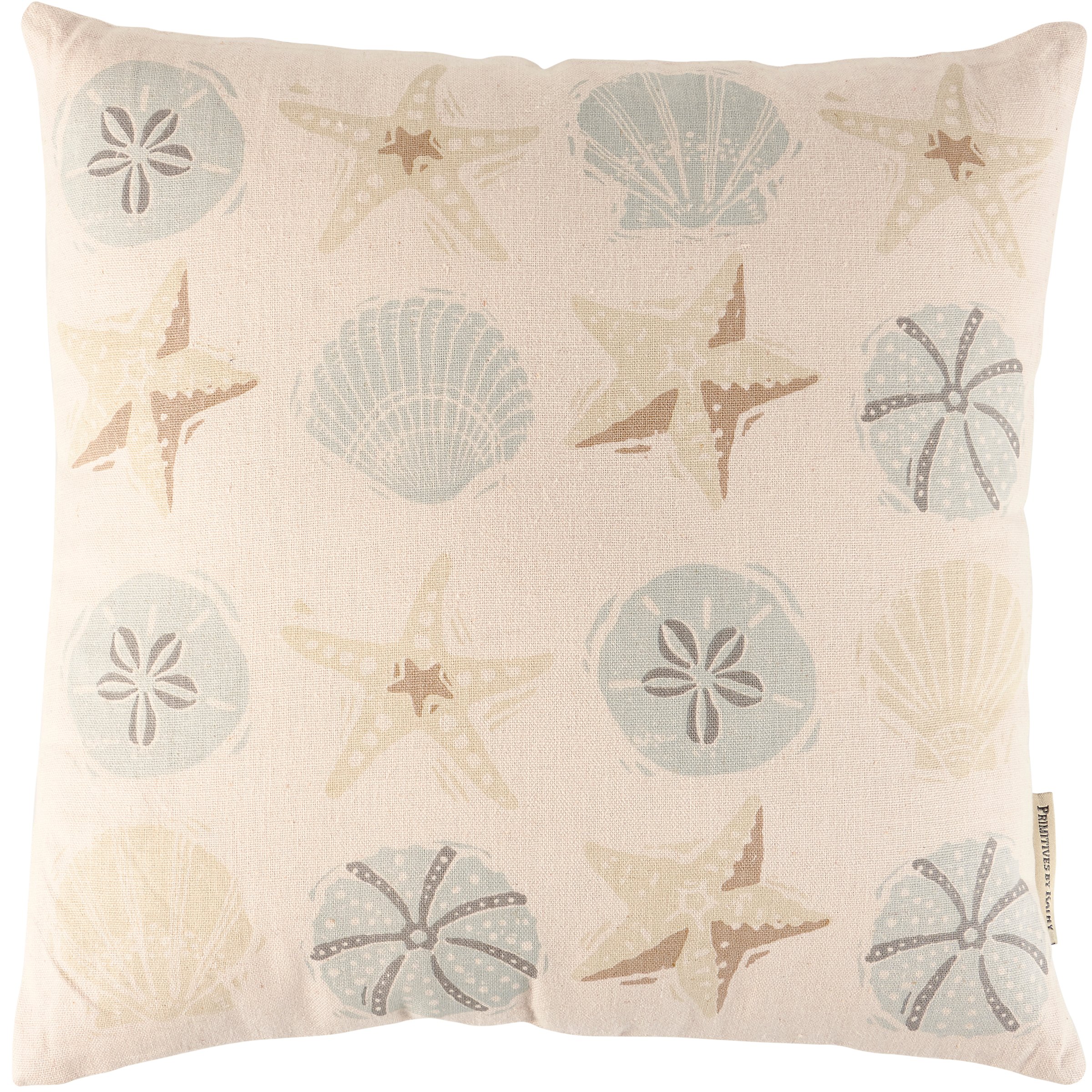 A decorative cotton-linen blend pillow from our Beach Collection displaying a seashell pattern in a unique block print art style on sand colored background. Our Seashells pillow includes a zipper to easily remove and clean machine-washable pillow cover. Pillow contains polyester filling and is shipped vacuum-sealed for protection and storage. A beach-themed home accent perfect for any room.