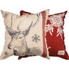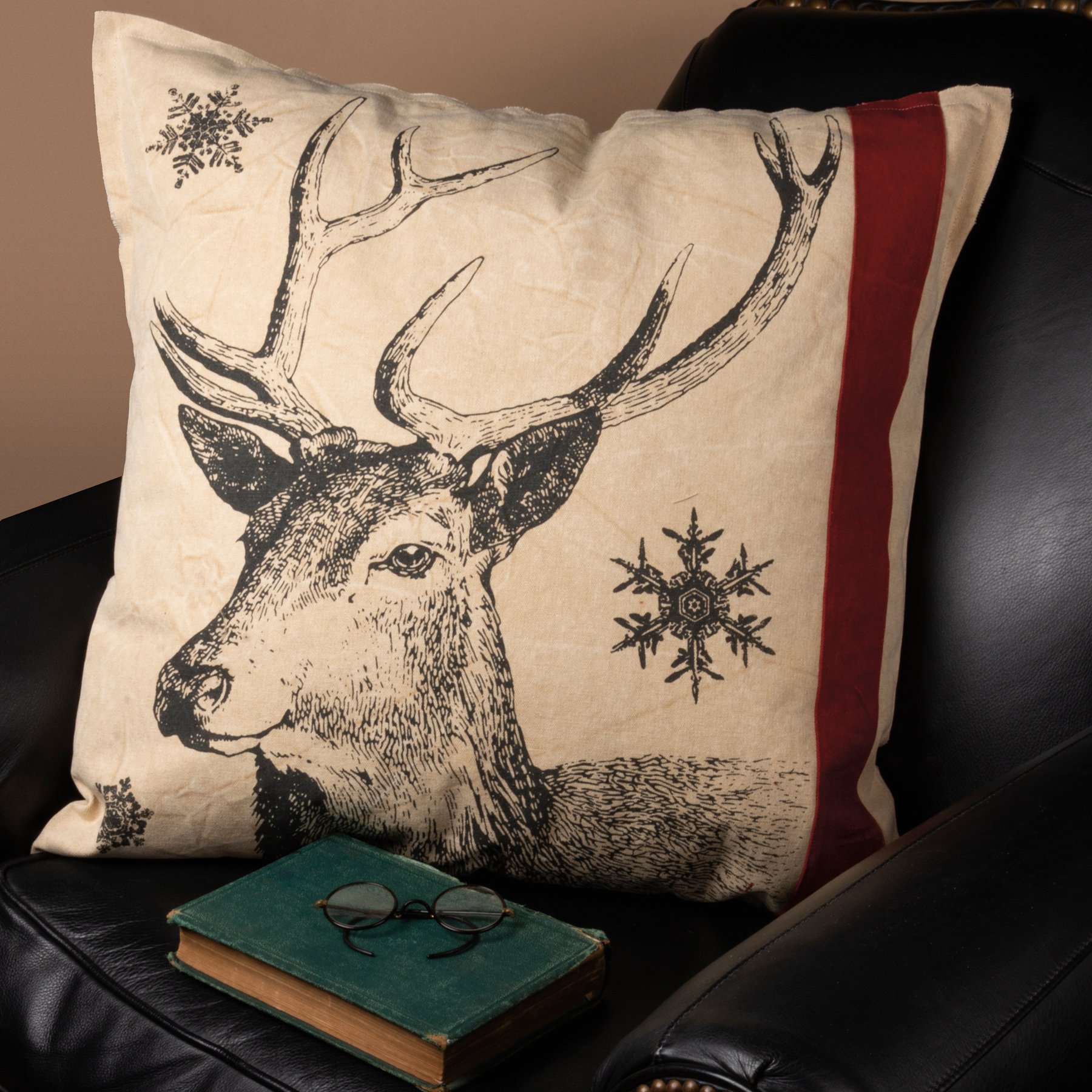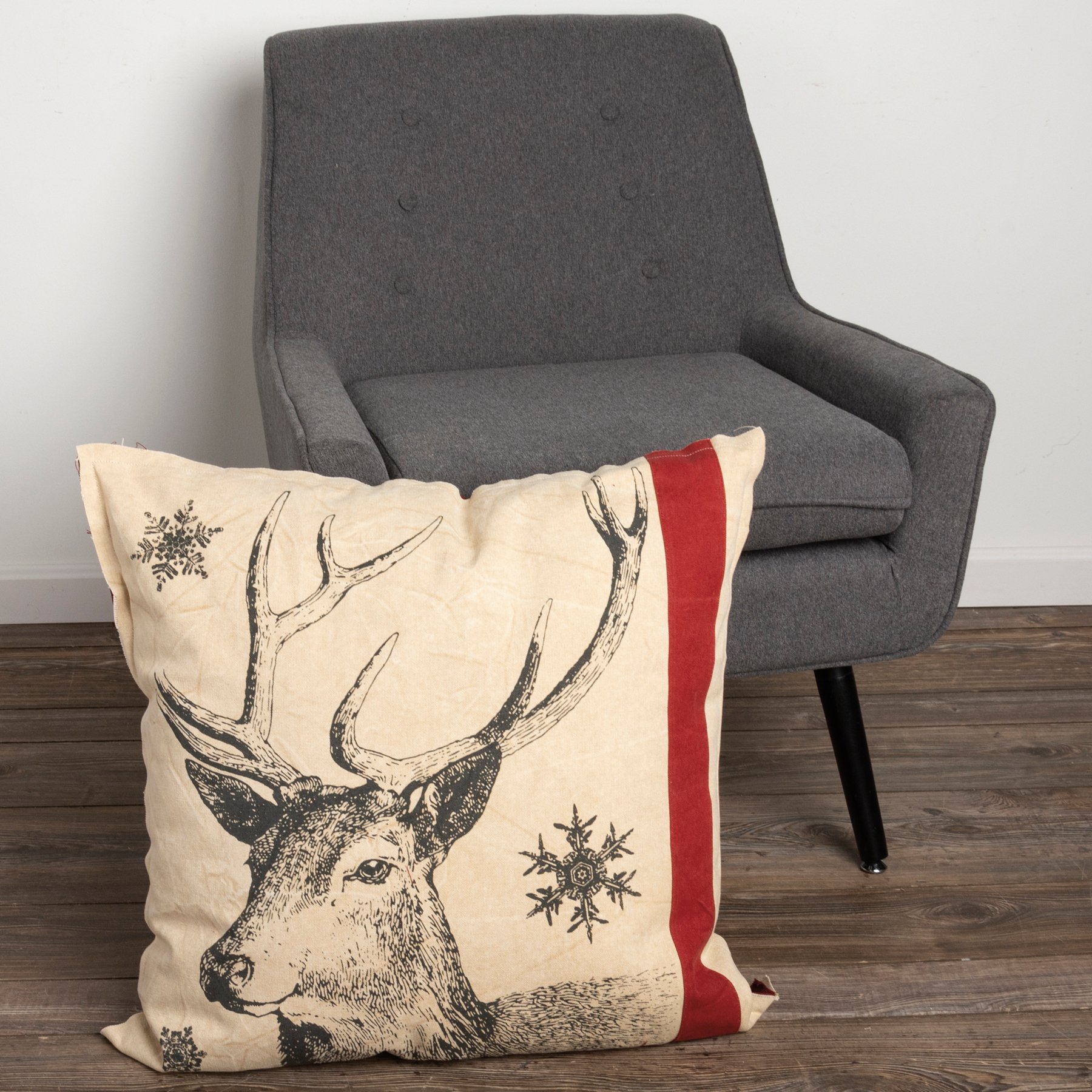 A double-sided canvas pillow featuring a front deer design and single stripe trim, reverse snowflake print designs, and flat panel trim. Complements well with existing decor for a cozy Christmas accent. Includes a zipper to easily remove and clean cover. Shipped vacuum sealed for protection and storage.