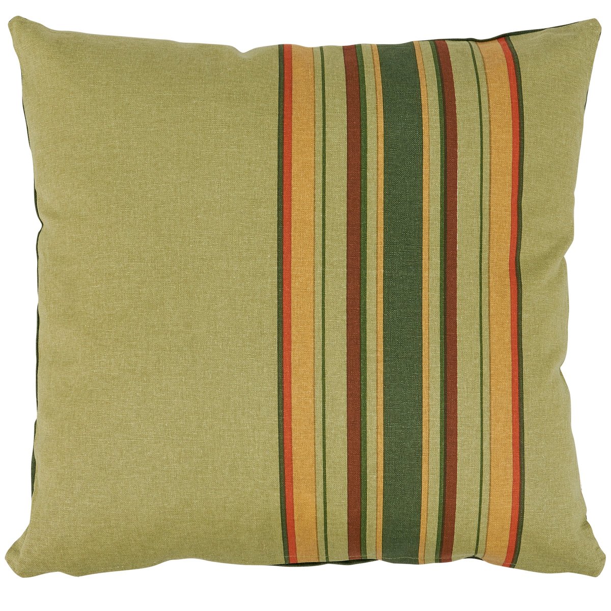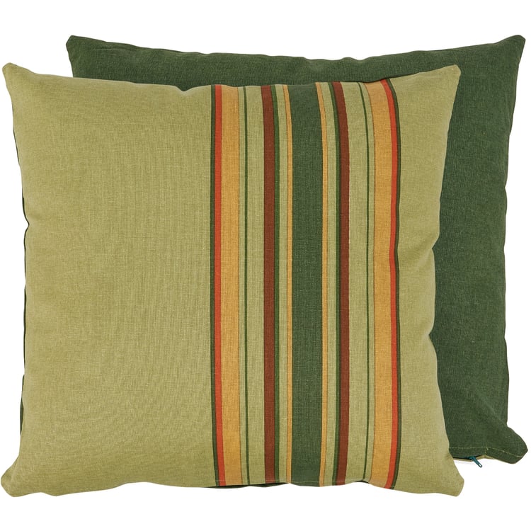 A cotton pillow from our Lake & Cabin Collection displaying a rustic green, brown, and orange stripe pattern on the front inspired by vintage cabin home décor. Cabin pillow features coordinating green color on the back. Our Striped Green pillow includes a zipper to easily remove and clean machine-washable pillow cover. Rustic pillow contains polyester filling and is shipped vacuum-sealed for protection and storage. A rustic home accent perfect for adding vintage style to any cabin or RV.
