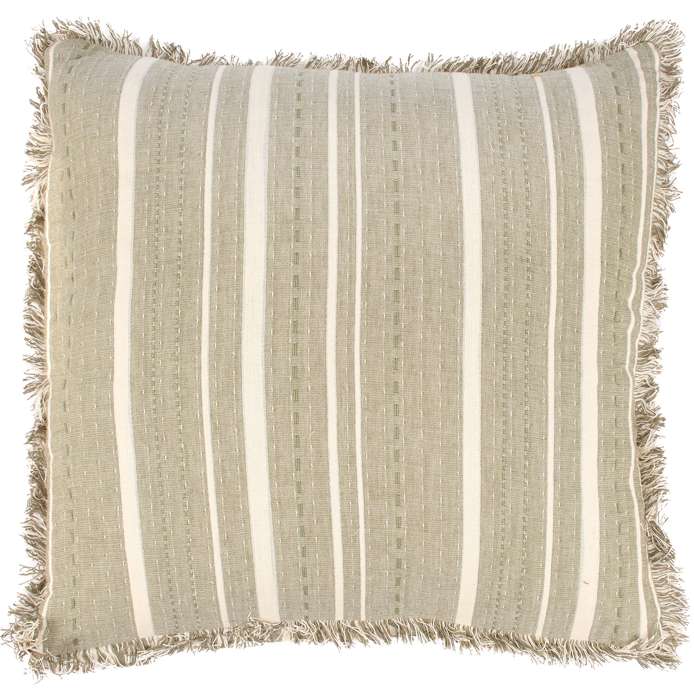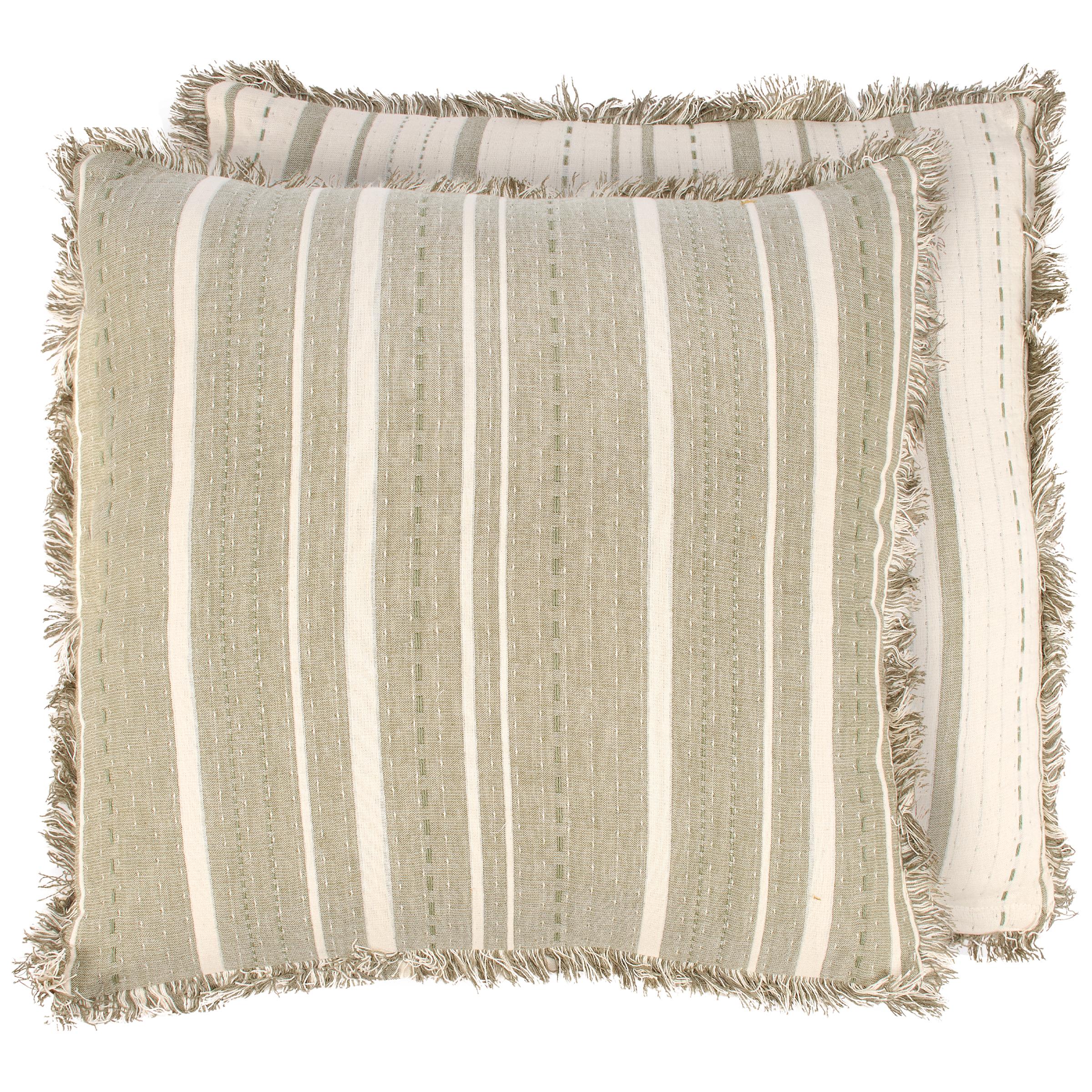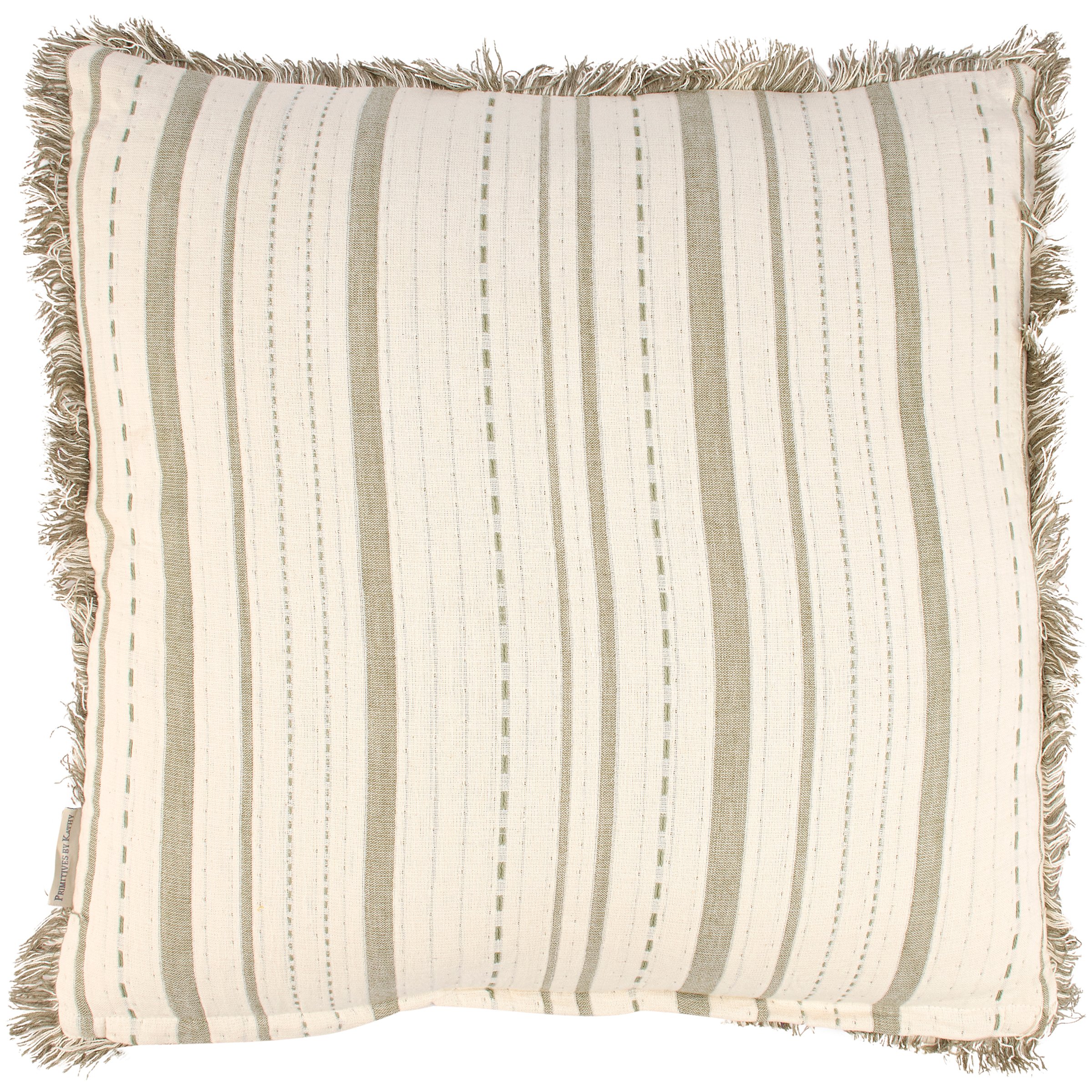 A decorative cotton throw pillow from our Home Collection displaying a vintage cream and green stripe pattern with yarn stitched details and a coordinating fringe trim. Back of pillow features alternate stripe pattern. Our Striped Green pillow includes a zipper to easily remove and clean machine-washable pillow cover. Vintage pillow contains polyester filling and is shipped vacuum-sealed for protection and storage. An everyday home accent that adds vintage style to any room.