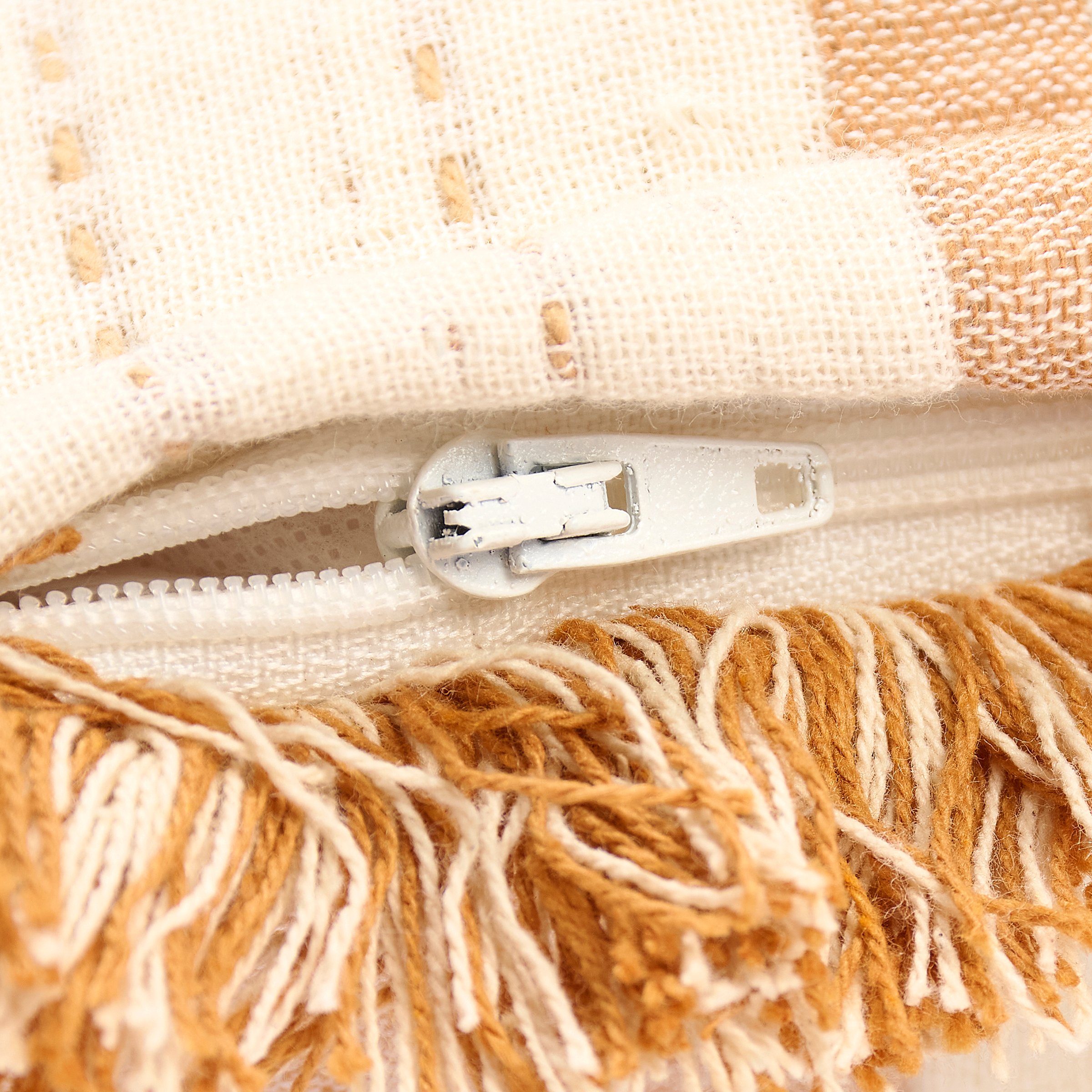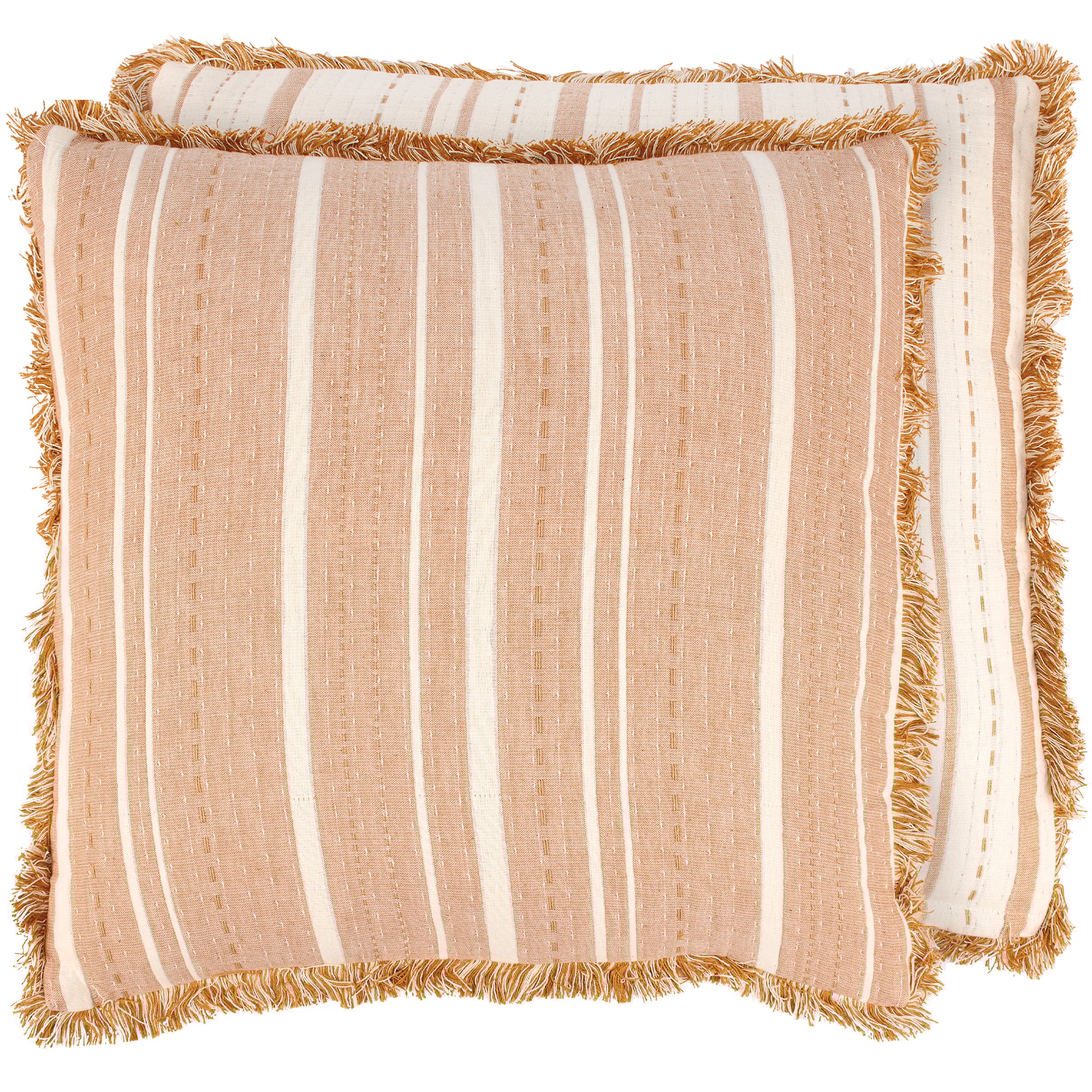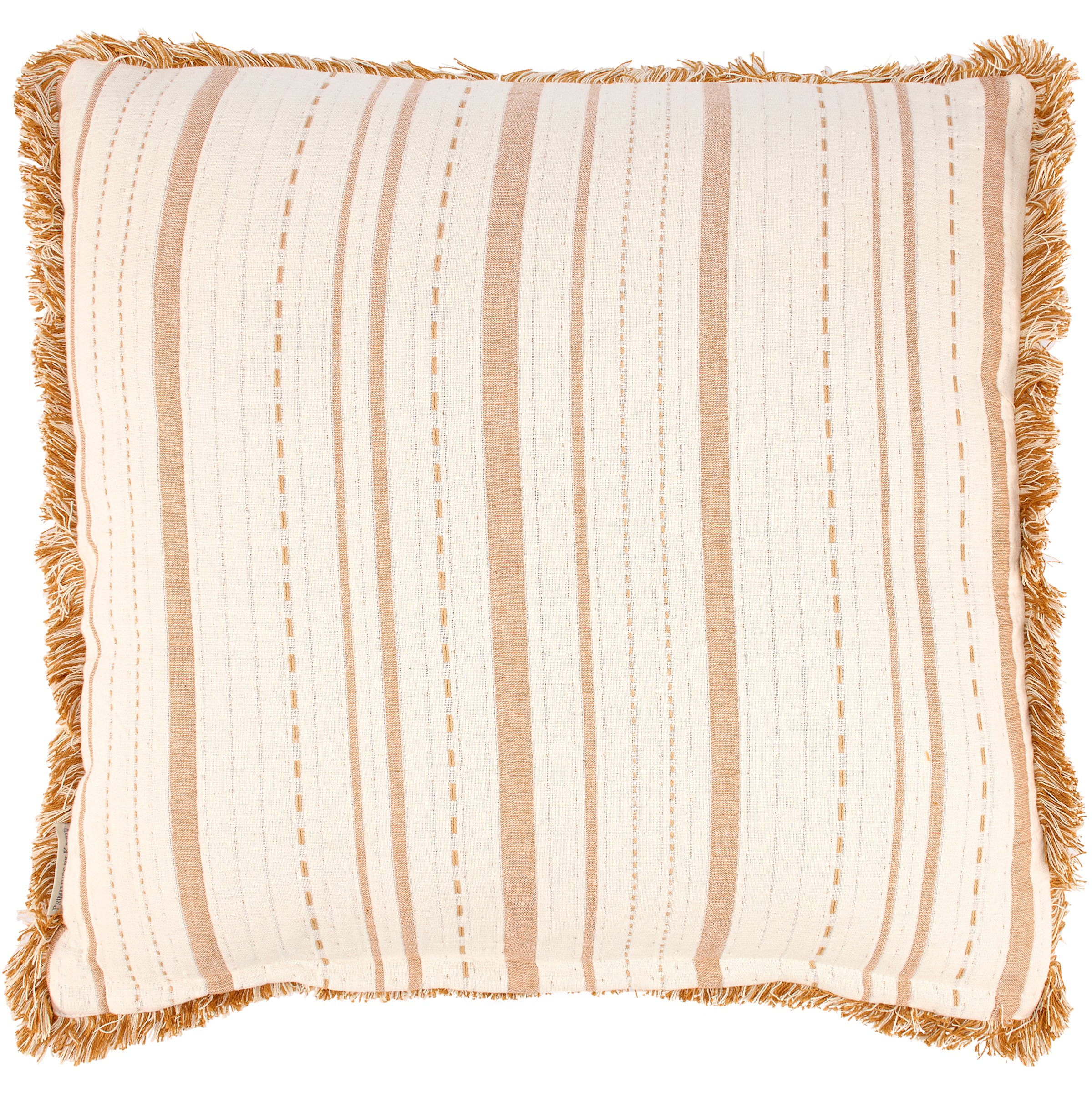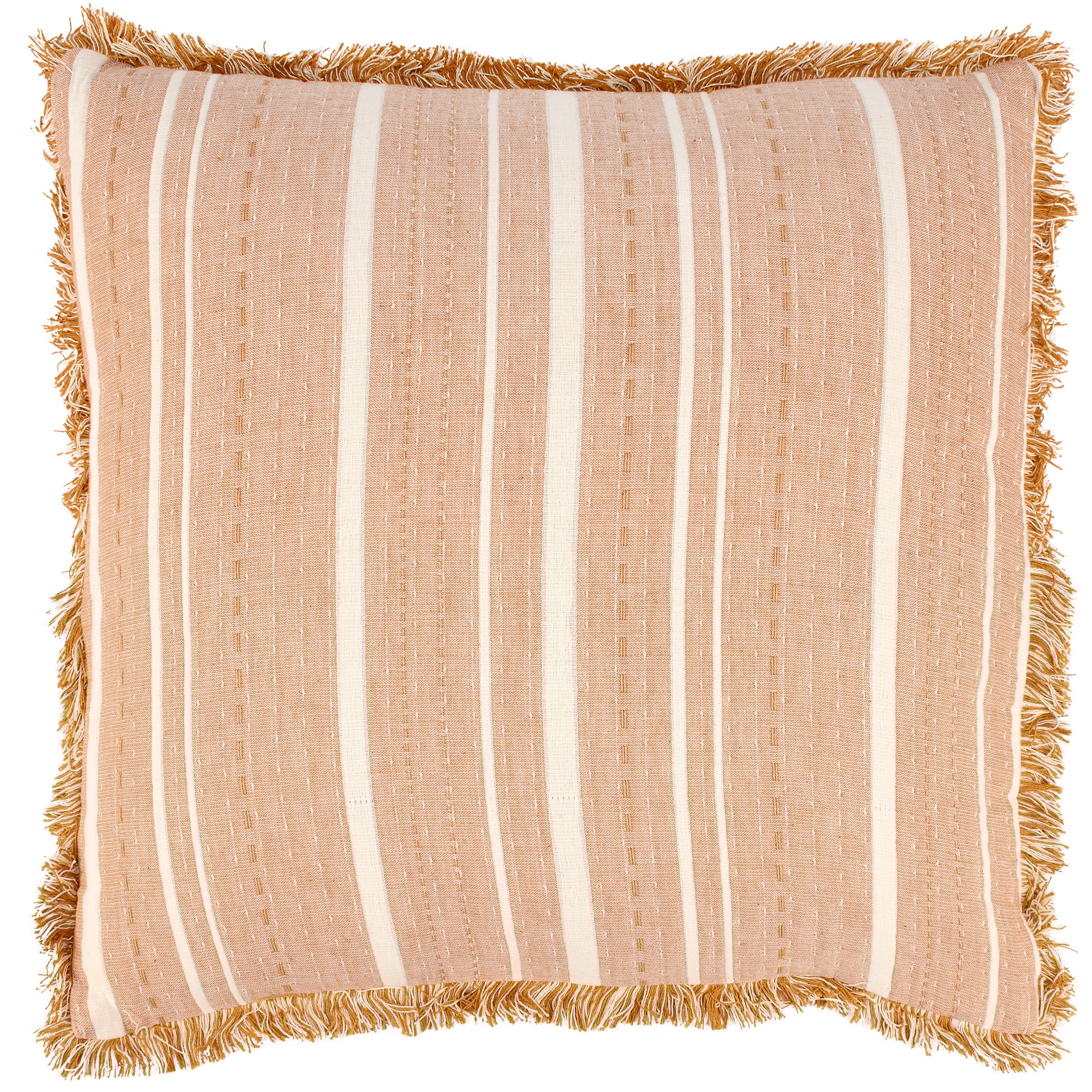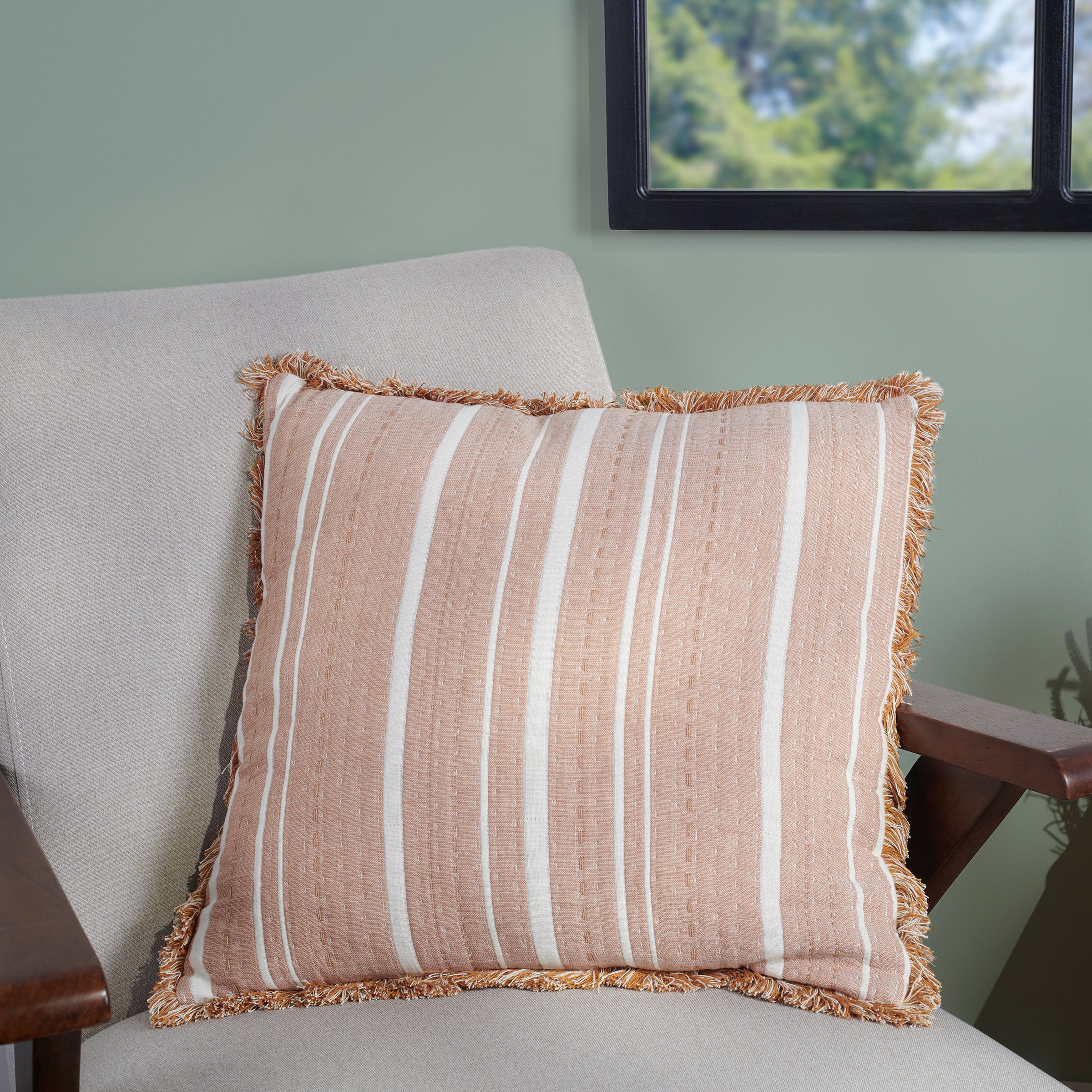 A decorative cotton throw pillow from our Home Collection displaying a vintage cream and rust orange stripe pattern with yarn stitched details and a coordinating fringe trim. Back of pillow features alternate stripe pattern. Our Striped Rust pillow includes a zipper to easily remove and clean machine-washable pillow cover. Vintage pillow contains polyester filling and is shipped vacuum-sealed for protection and storage. An everyday home accent that adds vintage style to any room.