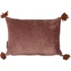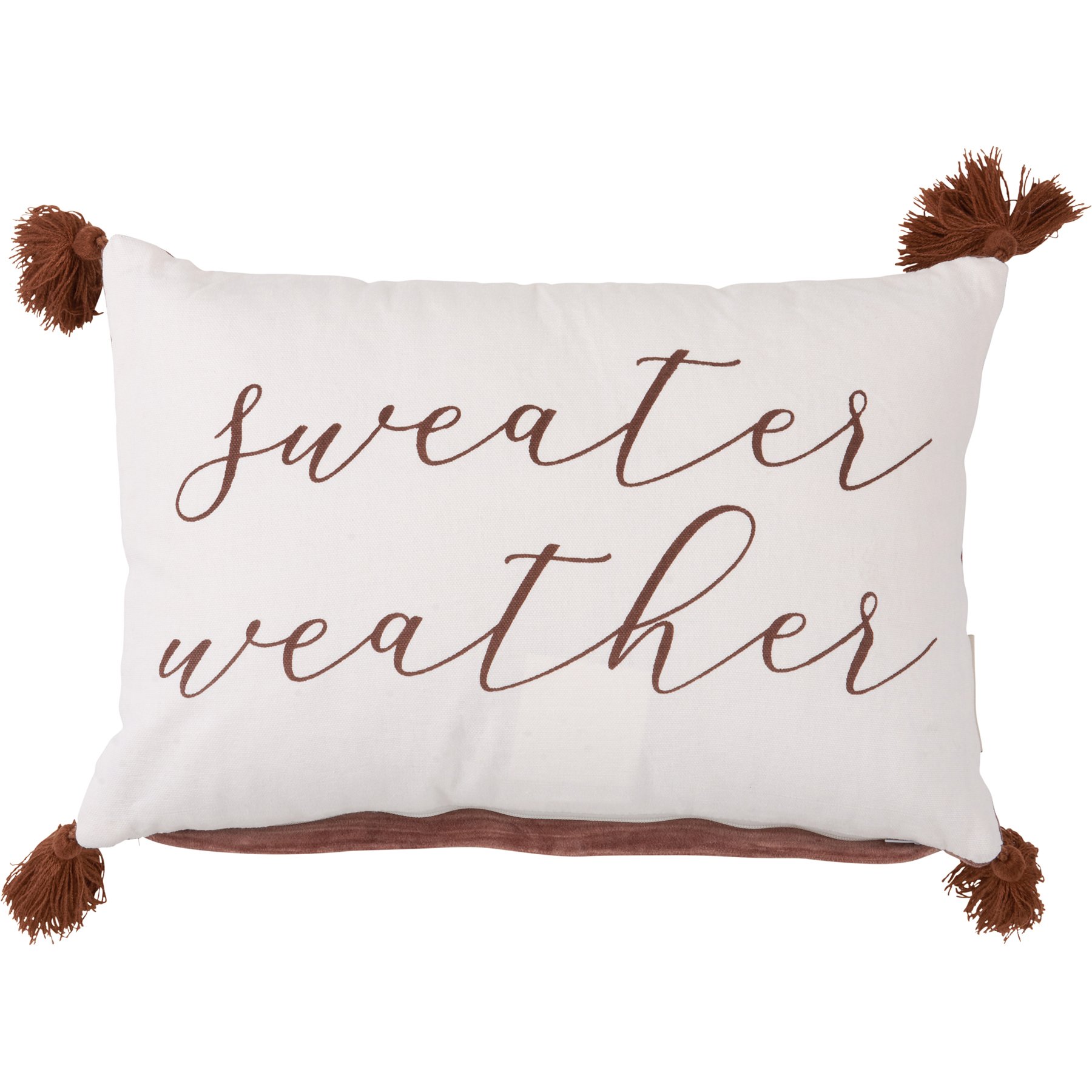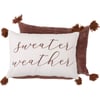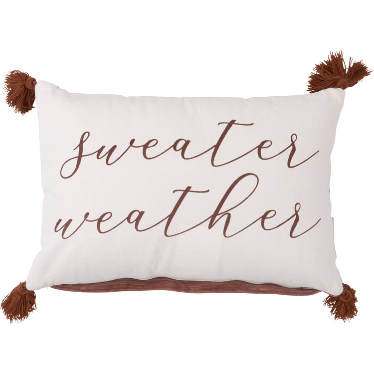 A cotton pillow from our Fall & Harvest Collection displaying natural autumn tones with "Sweater Weather" sentiment. Pillow features dark brown velvet on the back and tassels on the corners for added interest. Includes a zipper to easily remove and clean cover. The Sweater Weather pillow contains polyester filling and is shipped vacuum-sealed for protection and storage.