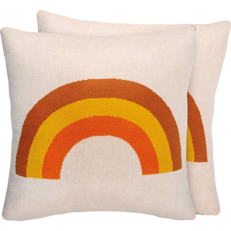 A cotton pillow featuring a bohemian style design with a tri-color rainbow design. Polyester filling. Our Tri-color Rainbow pillow is shipped vacuum-sealed for protection and storage.