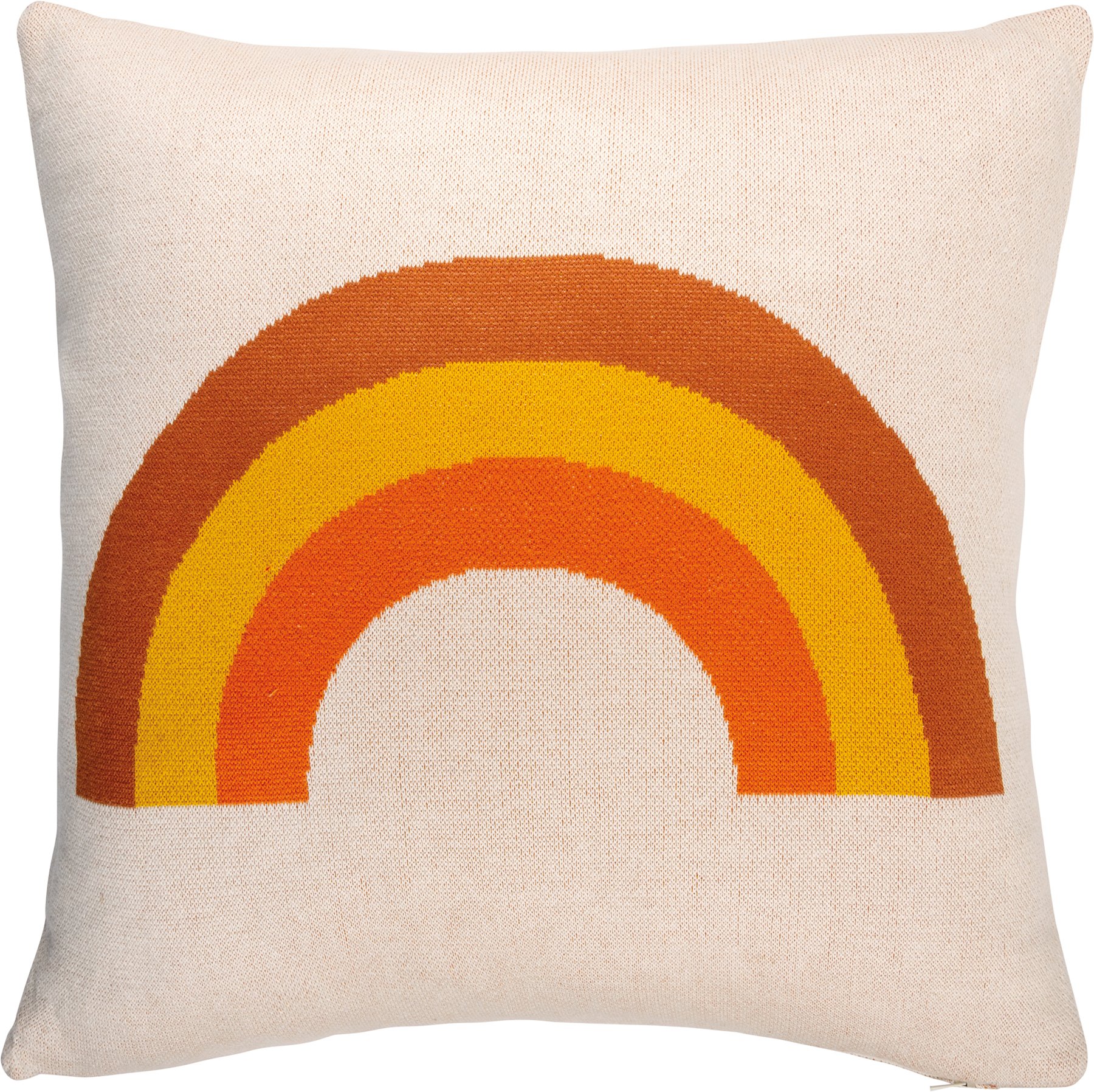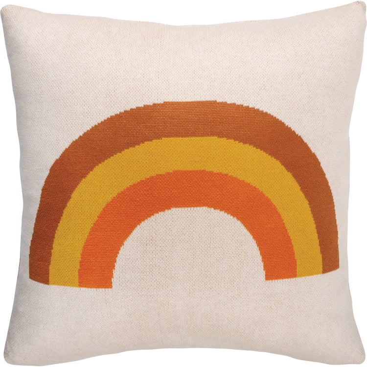 A cotton pillow featuring a bohemian style design with a tri-color rainbow design. Polyester filling. Our Tri-color Rainbow pillow is shipped vacuum-sealed for protection and storage.