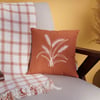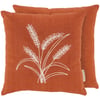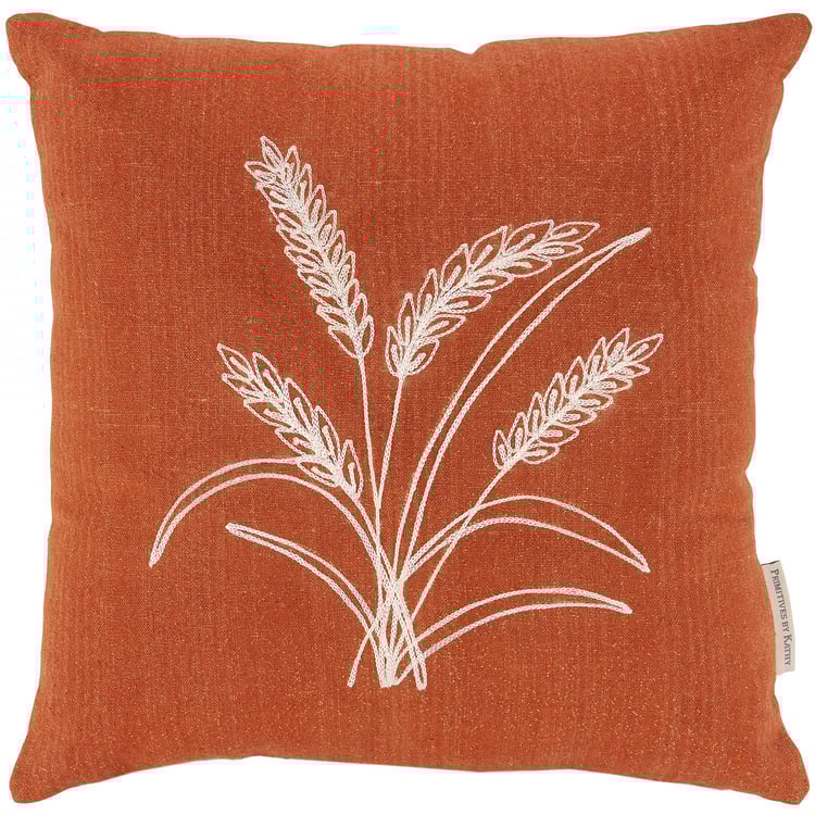 An orange cotton pillow from our Fall & Harvest Collection displaying a wheat stalk design made with chain stitching for added texture. Our Wheat Stalks pillow features a zipper to easily remove and clean machine-washable pillow cover. Seasonal pillow contains polyester filling and is shipped vacuum-sealed for protection and storage. A fall home accent perfect for adding seasonal style to any room.