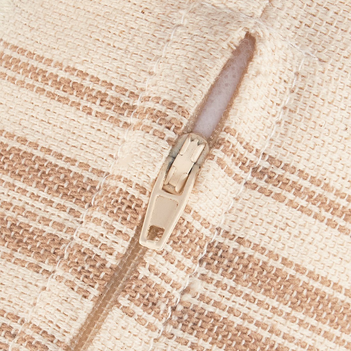 A cream cotton throw pillow from our Farmhouse Collection featuring a stitched art panel with frayed border and woven brown stripe designs throughout. Art panel displays a white highland cow in a field replicated from original artwork painted onto burlap canvas, giving the art a unique depth and texture. Our White Highland pillow also features frayed trim along sides with a zipper to easily remove and clean machine-washable pillow cover. Contains polyester filling and is shipped vacuum-sealed for protection and storage. A rustic everyday home accent perfect for adding style to any room.