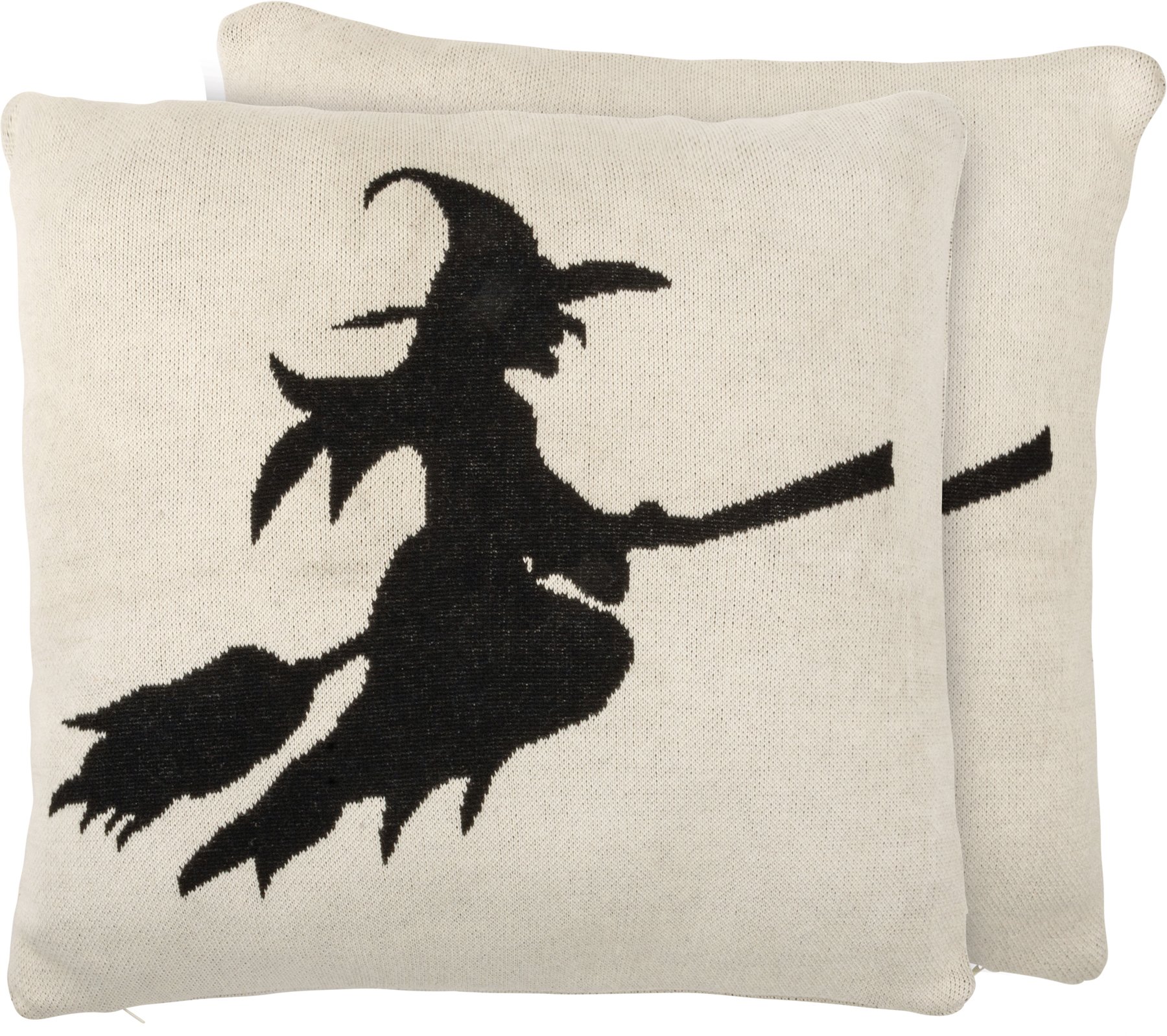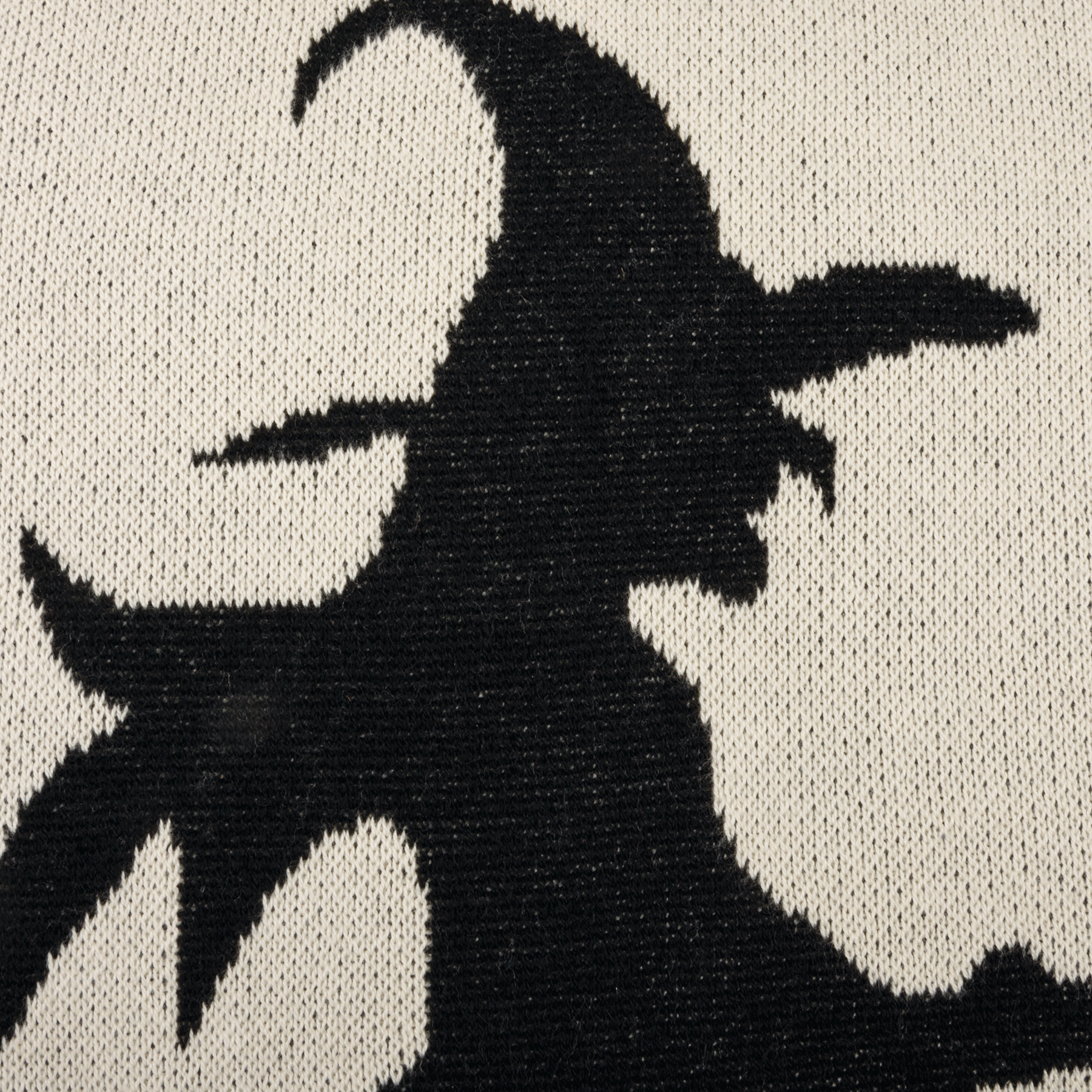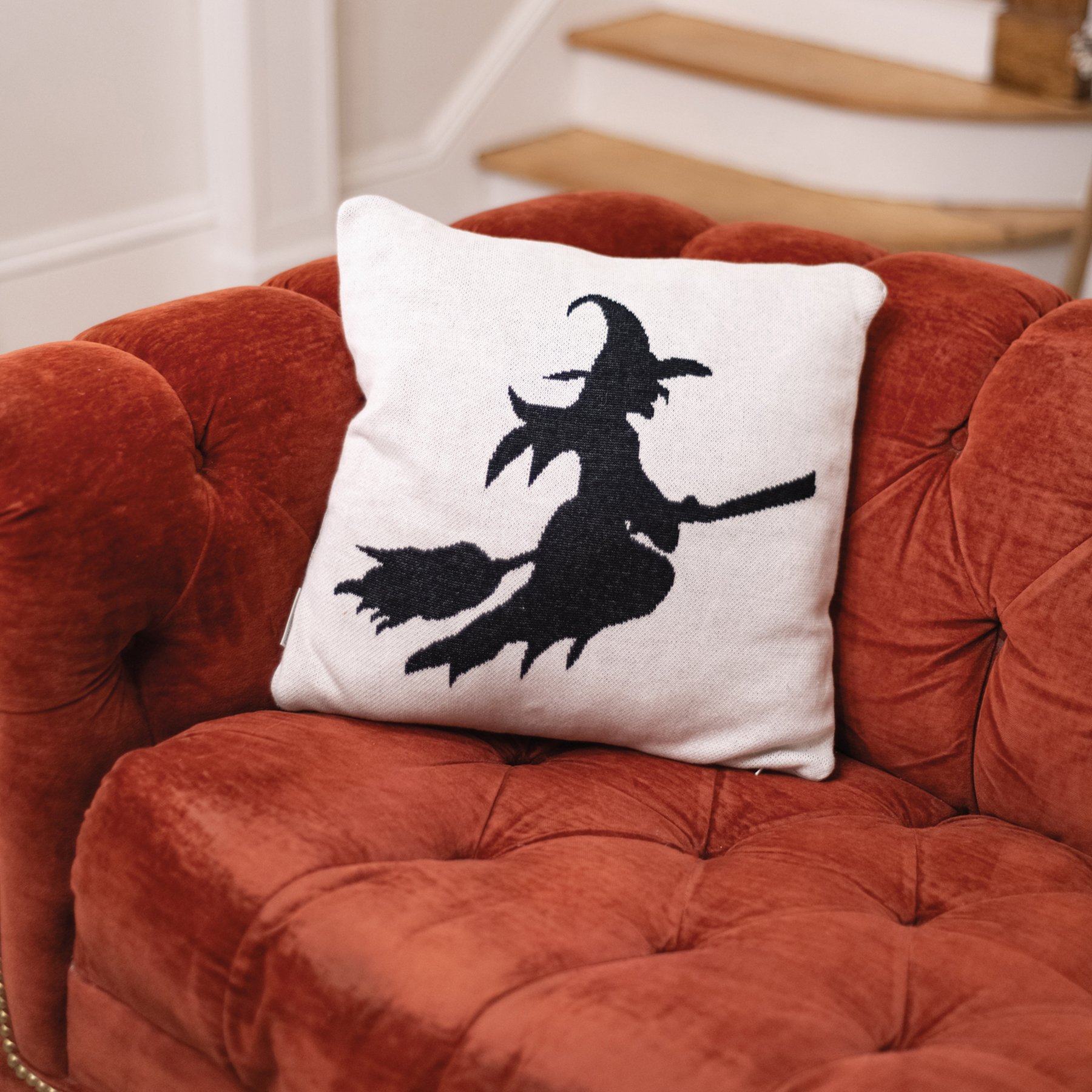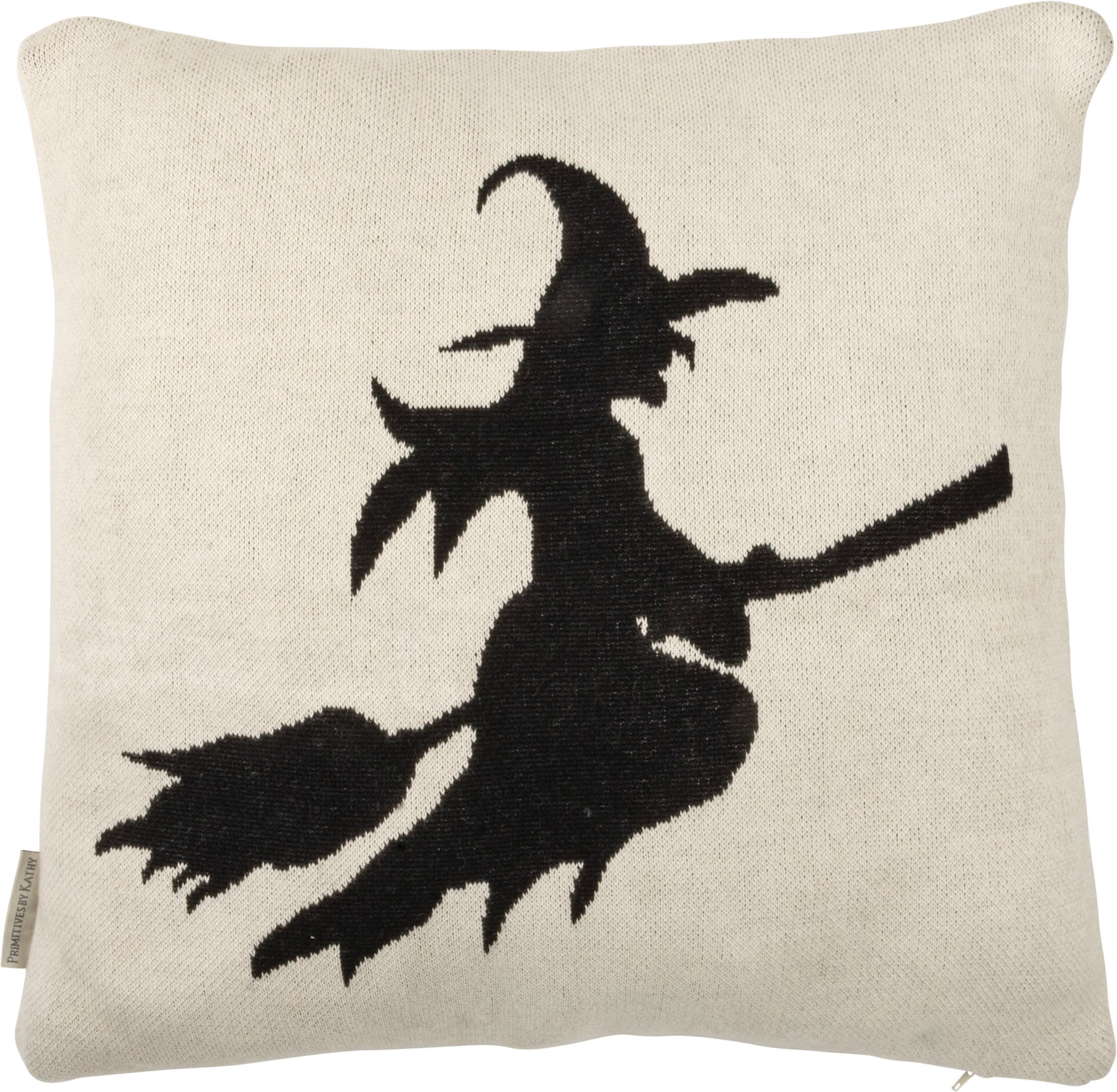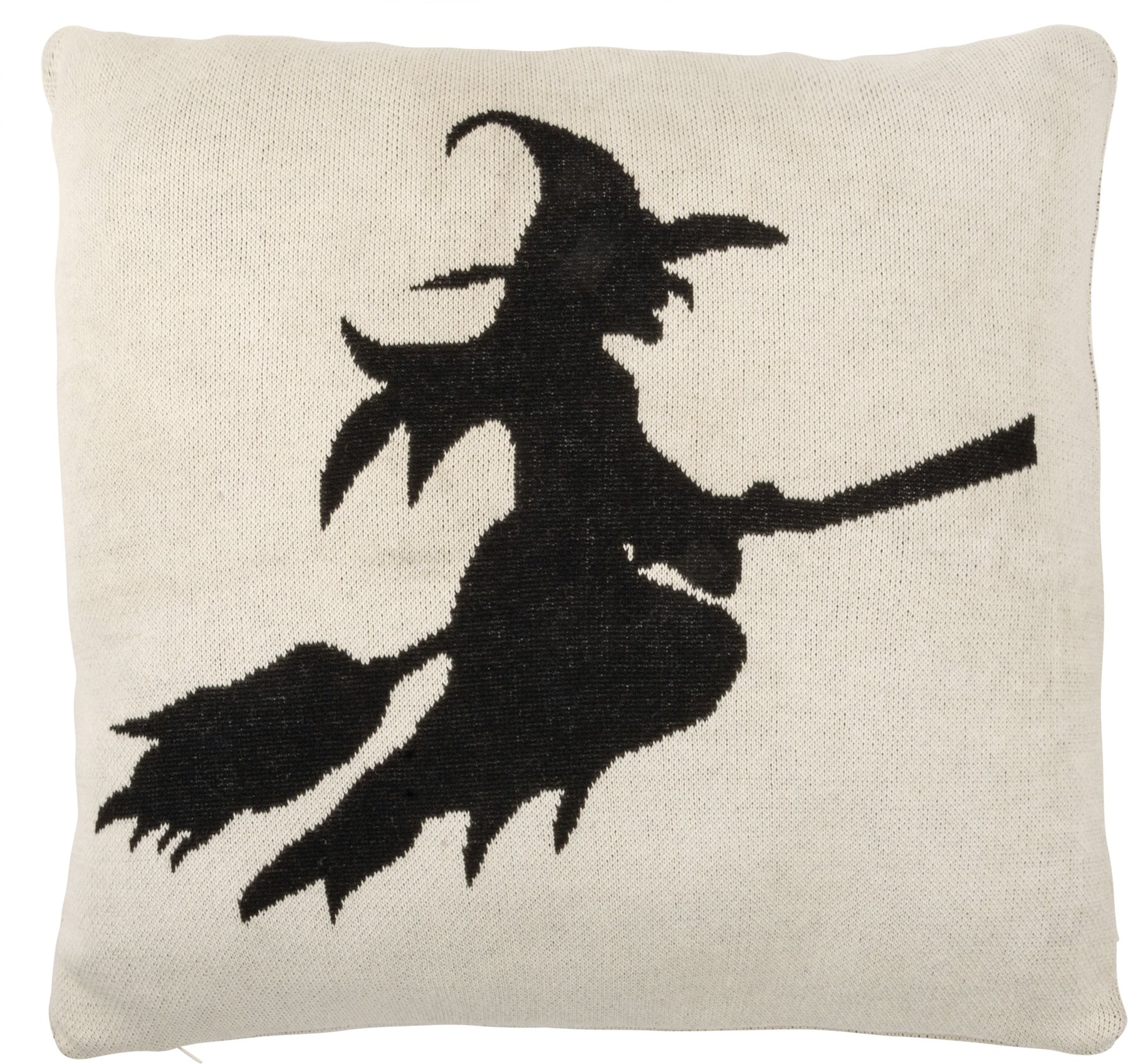A cotton pillow from our Halloween Collection displaying a silhouette of a witch riding a broom. Pillow features a double-sided design with machine knitted technique for cozy feel and a zipper to easily remove and clean cover. Our Witch pillow contains polyester filling and is shipped vacuum-sealed for protection and storage.