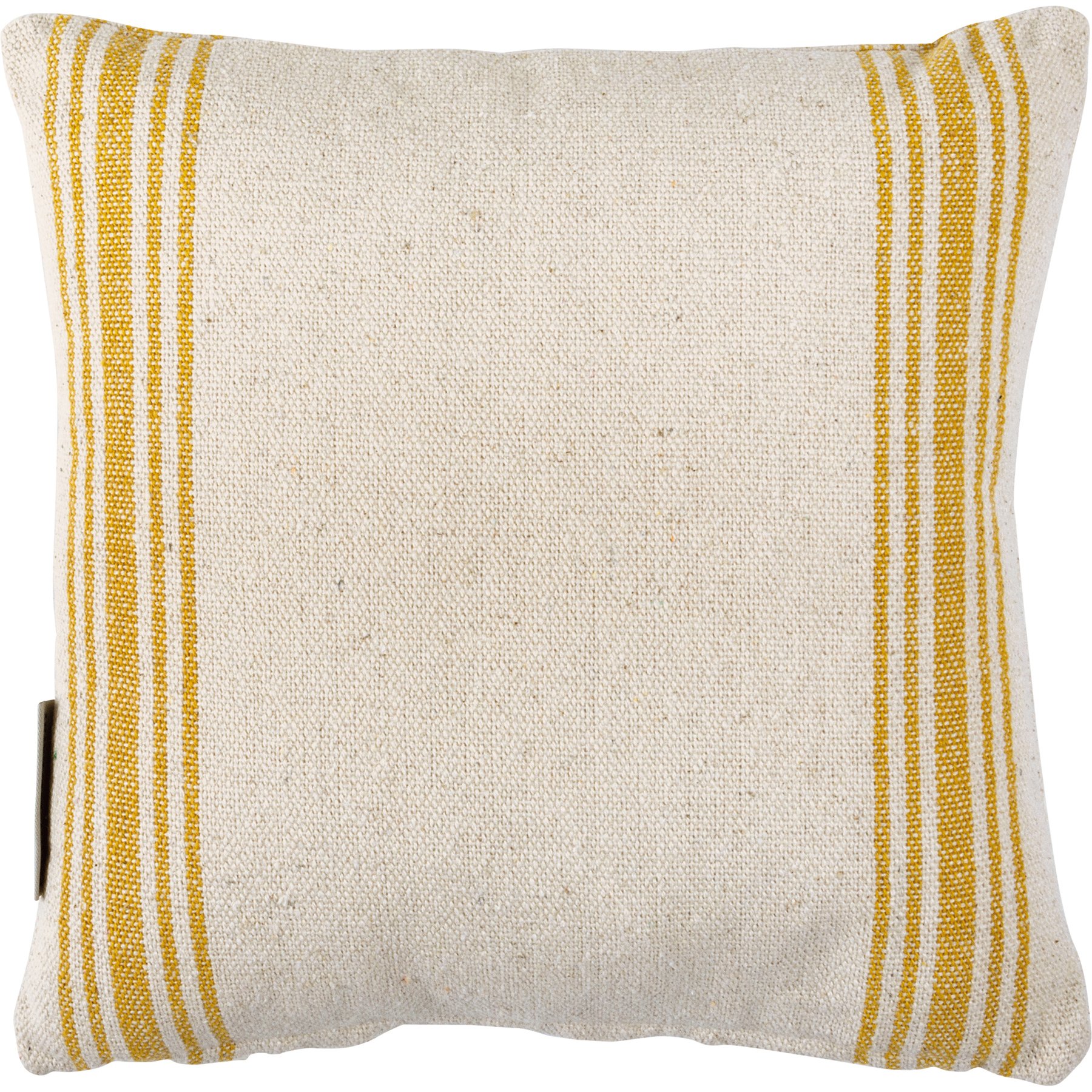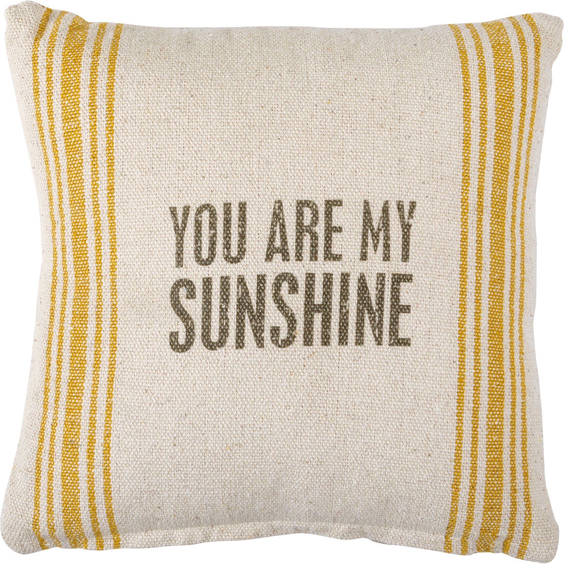 A cotton pillow from our Word Art Linens Collection featuring a distressed "You Are My Sunshine" sentiment and gold stripe designs. Polyester filling. You Are My Sunshine pillow is shipped vacuum-sealed for protection and storage.