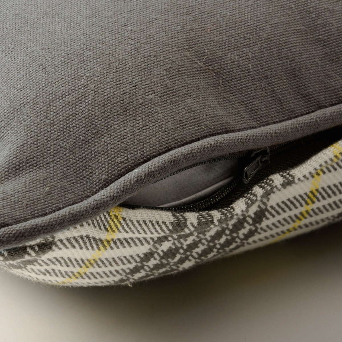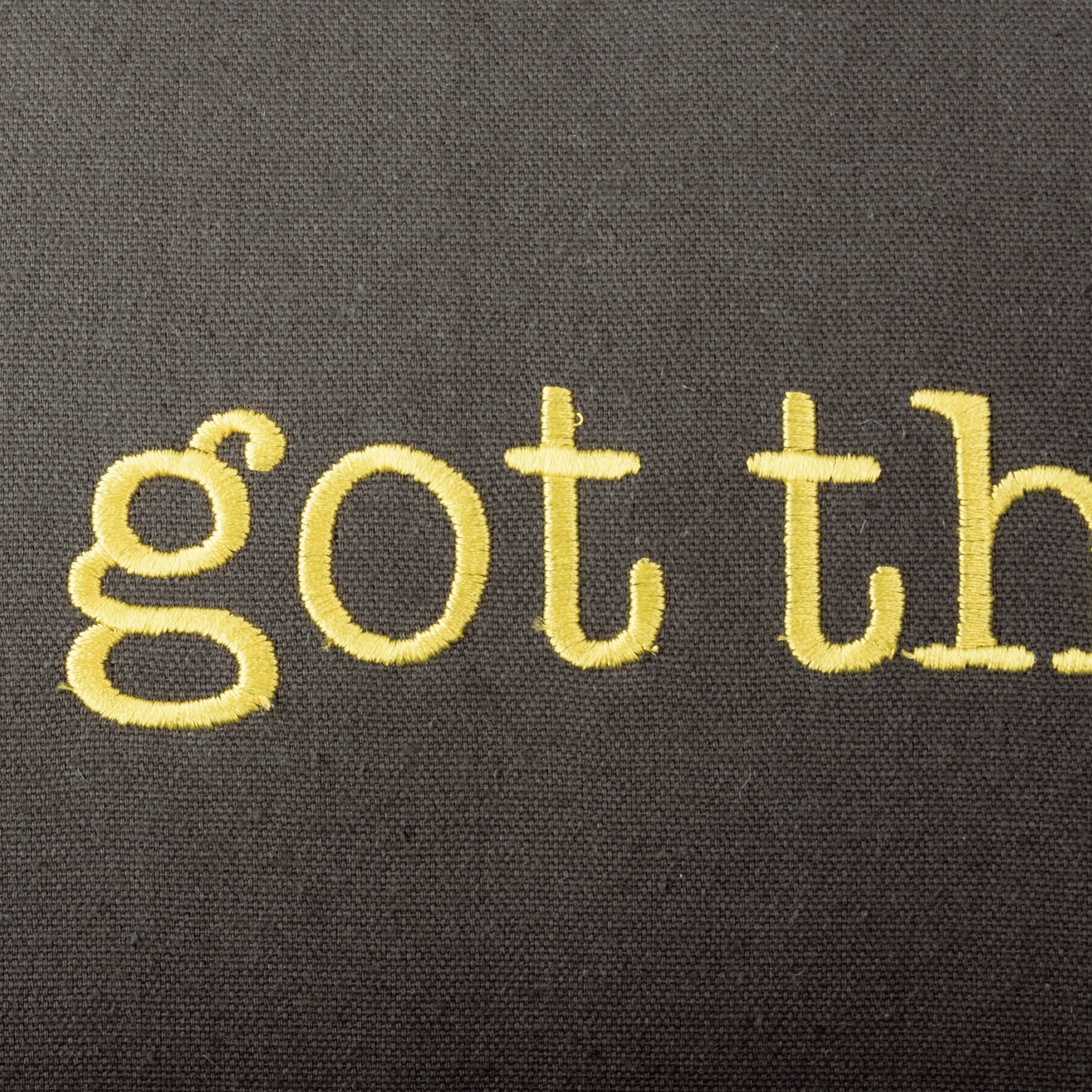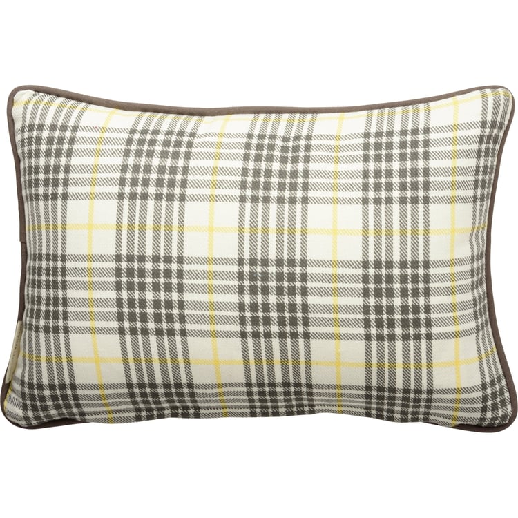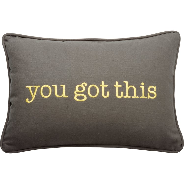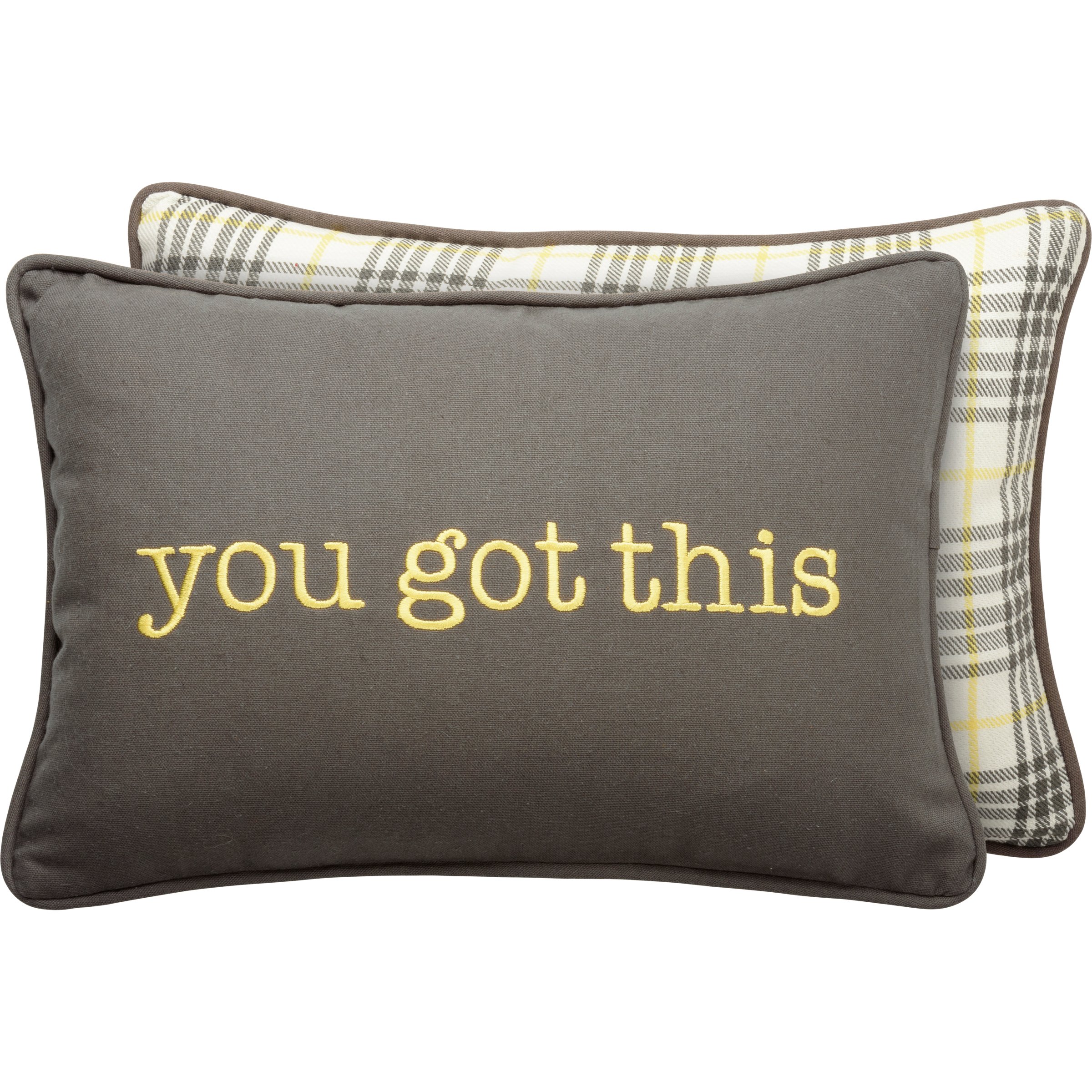 A double-sided cotton pillow featuring a front embroidered "You Got This" sentiment in yellow on a gray base. Reverse side features a gray and yellow plaid design. Pillow features gray piping for added interest. Includes zipper to easily remove and clean cover. Polyester filling. Shipped vacuum-sealed for protection and storage.