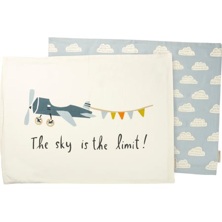 A set of two double-sided cotton pillow cases featuring a neutral palette. One features "The Sky Is The Limit!" sentiment with jet plane and the other features all-over cloud design. Machine-washable. Complements well with other pieces in collection to create a cohesive display. A part of our exclusive Happy + Bright Collection. Textiles are phthalate and AZO dye free.