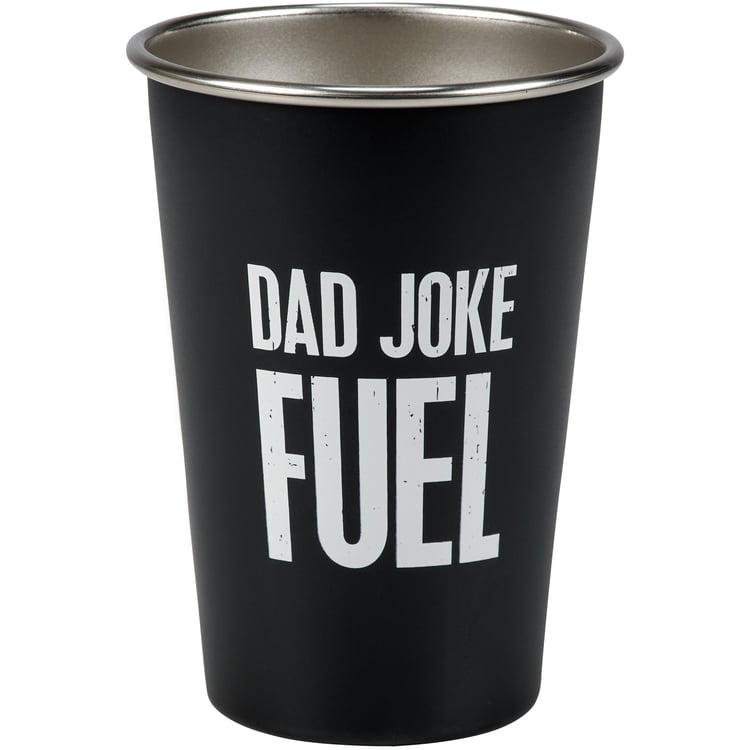 A stainless steel pint cup from our Father's Day Collection displaying a humorous dad-themed sentiment in a classic black and white box sign style that reads "Dad Joke Fuel". Our Dad Joke Fuel pint holds up to 16 oz. Do not microwave. Hand-wash only. A fun dad-themed gift perfect for everyday drinkware.