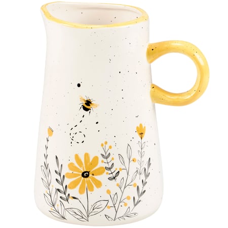 A durable stoneware pitcher from our Garden Collection displaying a bee inspired design with handmade details. Design features bee buzzing over flowers with yellow accents on rim and handle. Our Bee pitcher is dishwasher and food safe for convenient use. A piece of everyday tableware perfect for bee-themed gatherings.