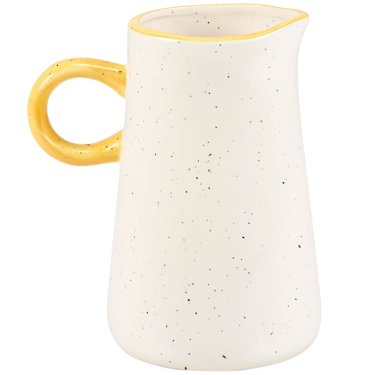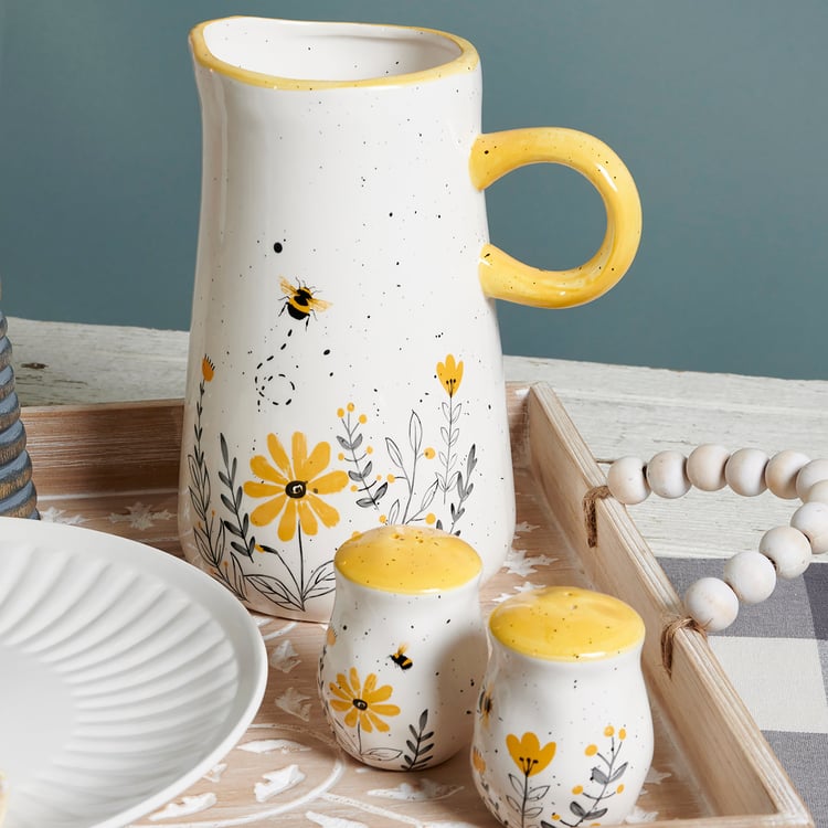 A durable stoneware pitcher from our Garden Collection displaying a bee inspired design with handmade details. Design features bee buzzing over flowers with yellow accents on rim and handle. Our Bee pitcher is dishwasher and food safe for convenient use. A piece of everyday tableware perfect for bee-themed gatherings.
