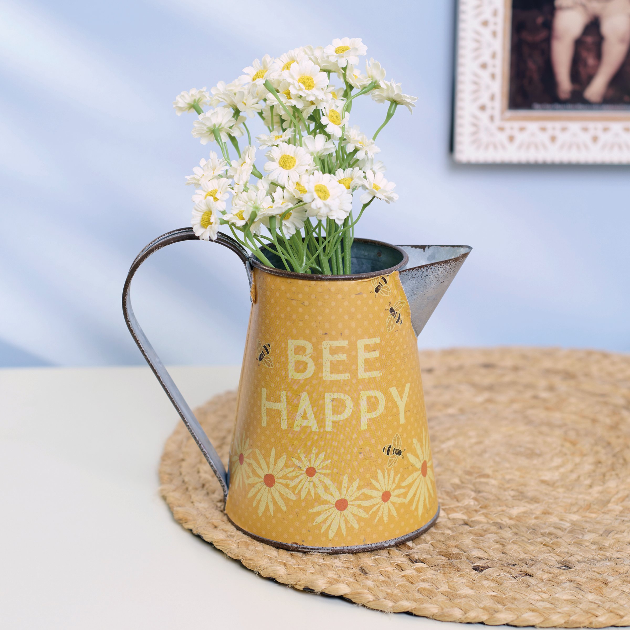 Great to gift or use in the kitchen or garden, a metal "Bee Happy" pitcher with polka dot, flower, and bumblebee designs. Complements well with coordinating designs to make for a charming spring decor collection.