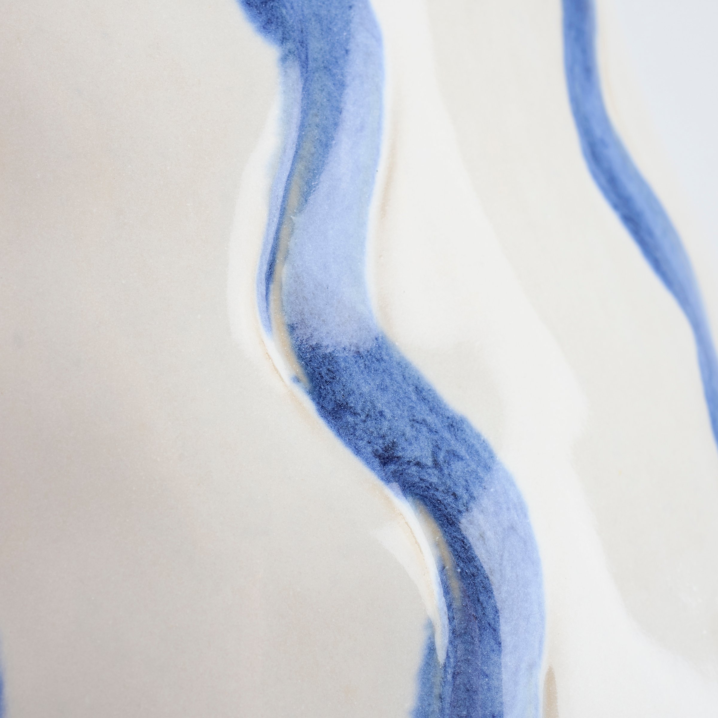 A durable stoneware pitcher from our Beach Collection displaying an ocean blue wavy strip pattern on white glaze finish. Our Blue Stripe pitcher is conveniently microwave, dishwasher, and food safe for easy use. A piece of stylish tableware perfect for beach themed tablescapes.