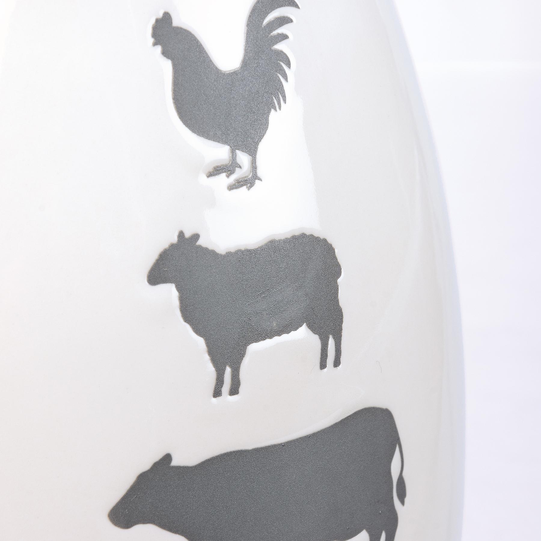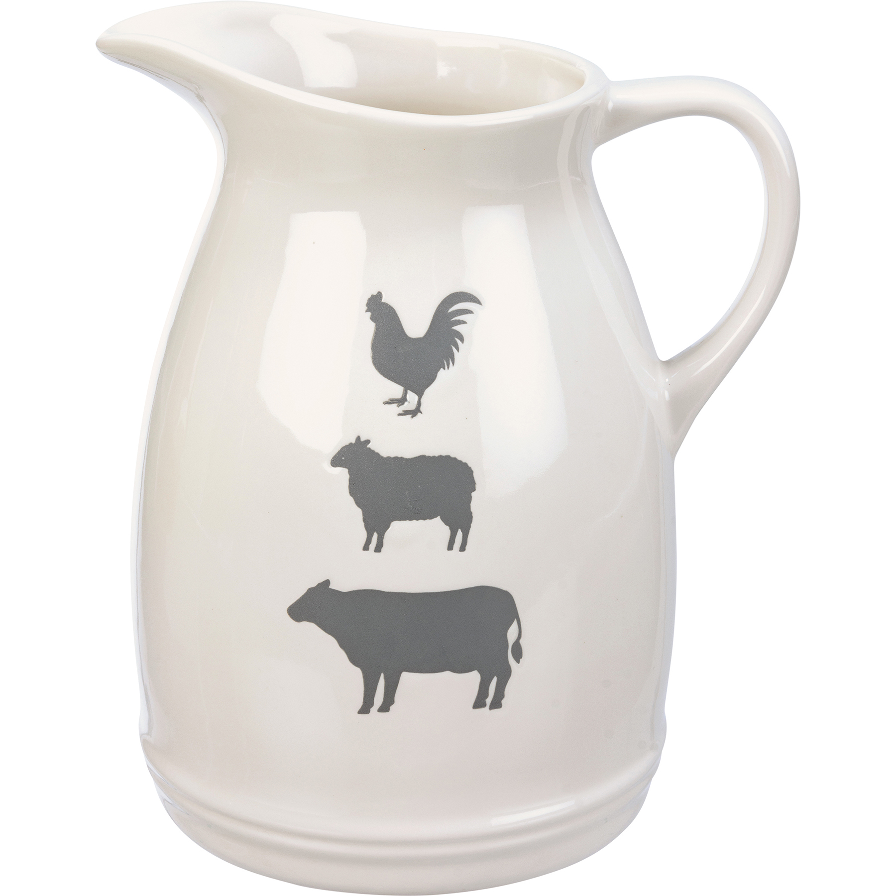 A white stoneware pitcher featuring debossed gray farm animal designs. Our Farm Animals pitcher is microwave, oven, dishwasher, and food safe.