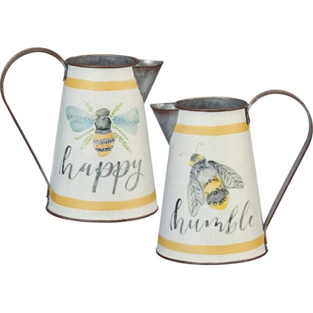 A metal pitcher featuring watercolor artwork, double-sided "Be Happy / Be Humble" sentiments, and bumblebee designs. Complements well with coordinating designs in collection for a refreshing spring display.