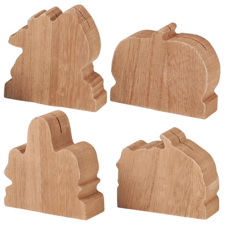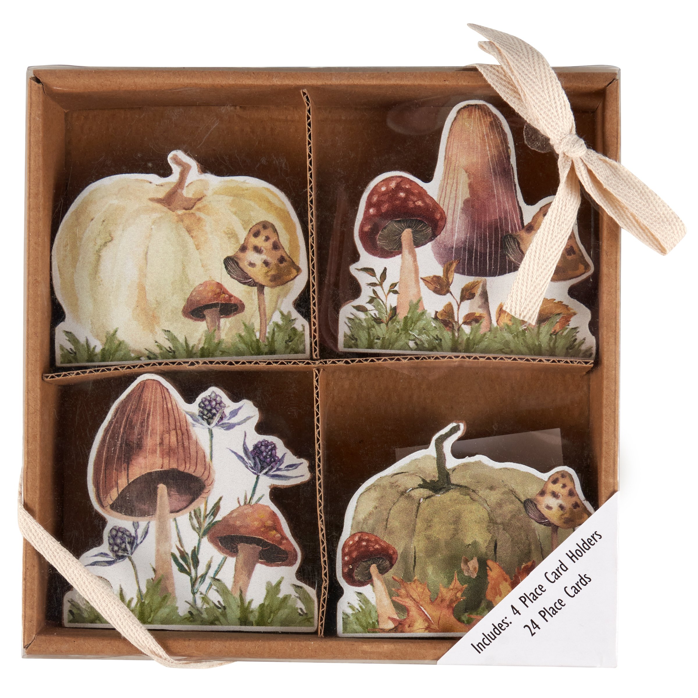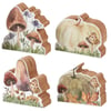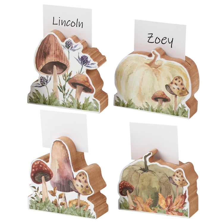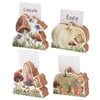A set of four wooden place card holders from our Fall & Harvest Collection displaying hand painted fall-themed designs on each. Holders feature individual shapes and designs of pumpkins and fall foliage with coordinating natural wood on sides and backs. Set also contains 24 place cards to customize. Our Fall Pumpkins place card holder set can free-stand on flat surface and features slots on top that hold customized place cards. Packaged together in a cardboard box displaying designs through acrylic lid and tied with cotton tape. A rustic set of tabletop accessories perfect for customizing seasonal place settings.