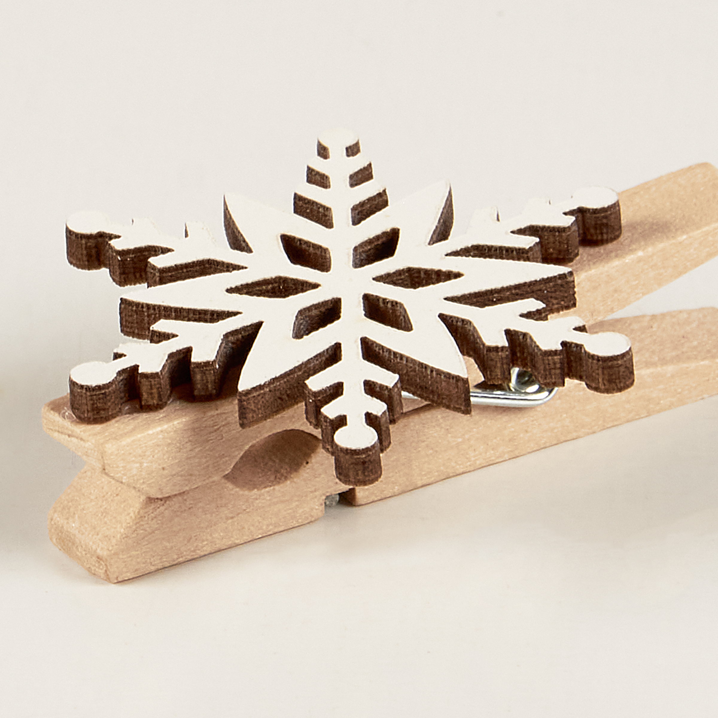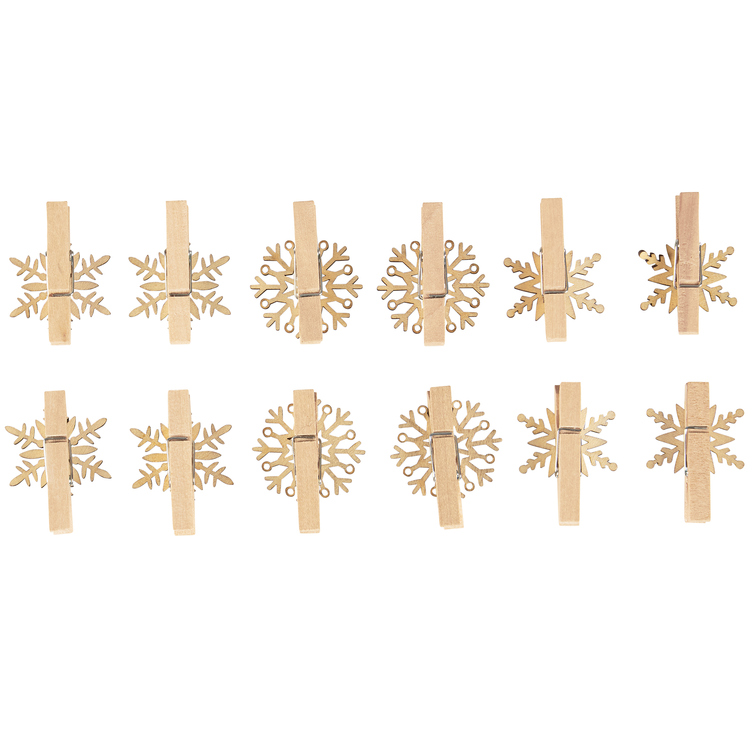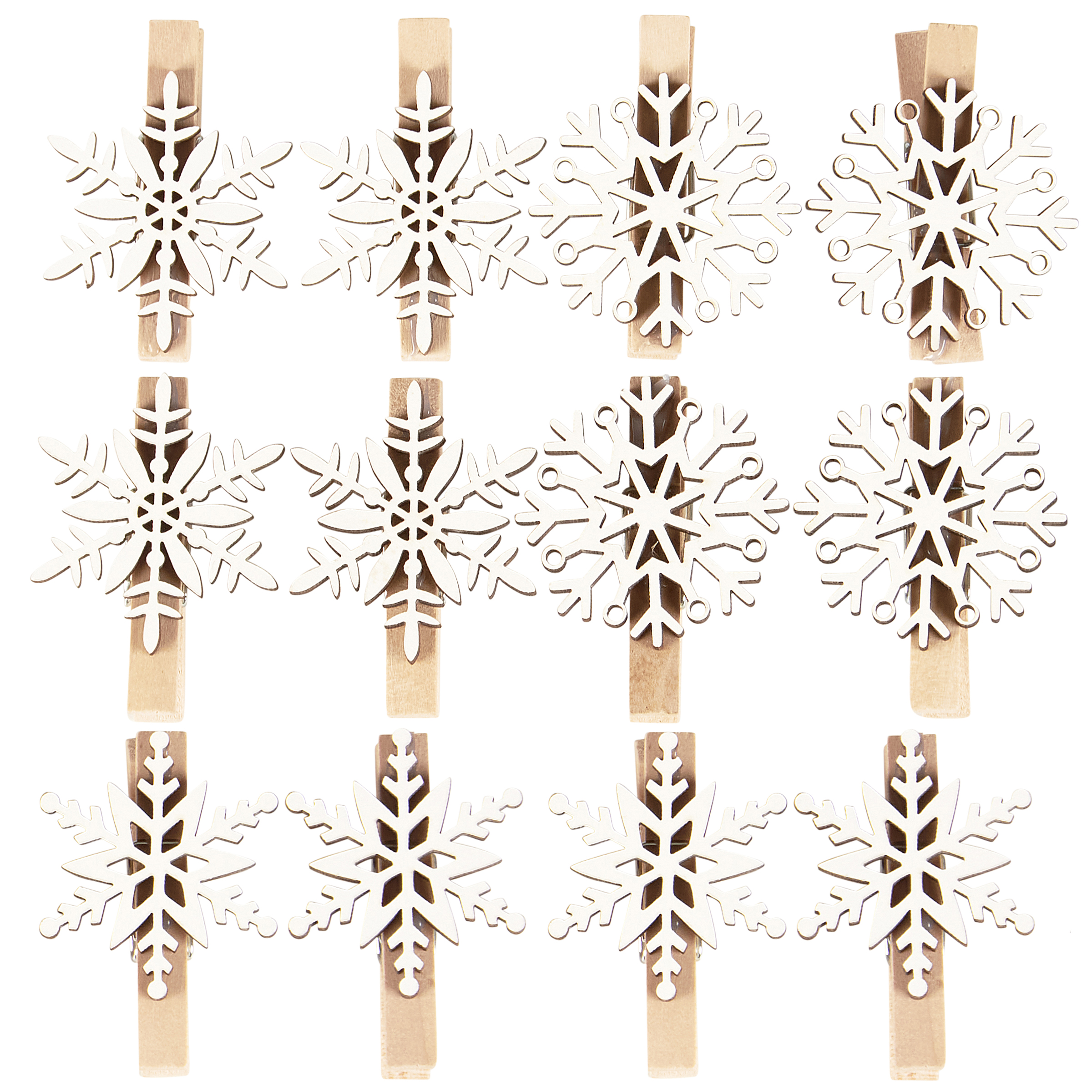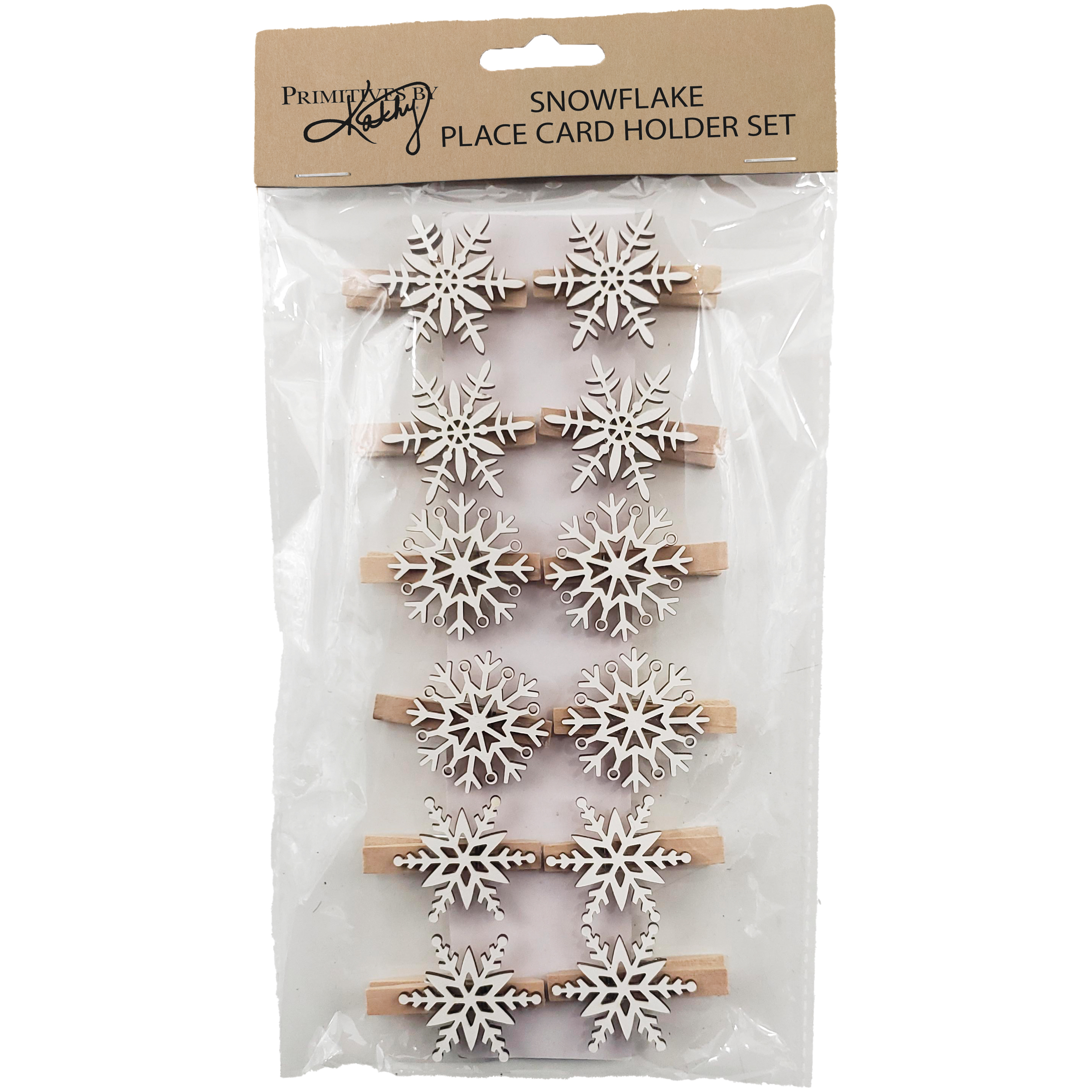 A set of 12 wooden place card holders from our Christmas Collection displaying various snowflake shaped designs on each. Holders feature natural wood pieces attached to clothespins that hold customized place cards and free-stand on flat surface. Place cards not included. Our Snowflake place card holder set comes packaged together in a polybag with header card. A fun set of tabletop accessories perfect for customizing seasonal place settings.