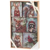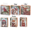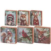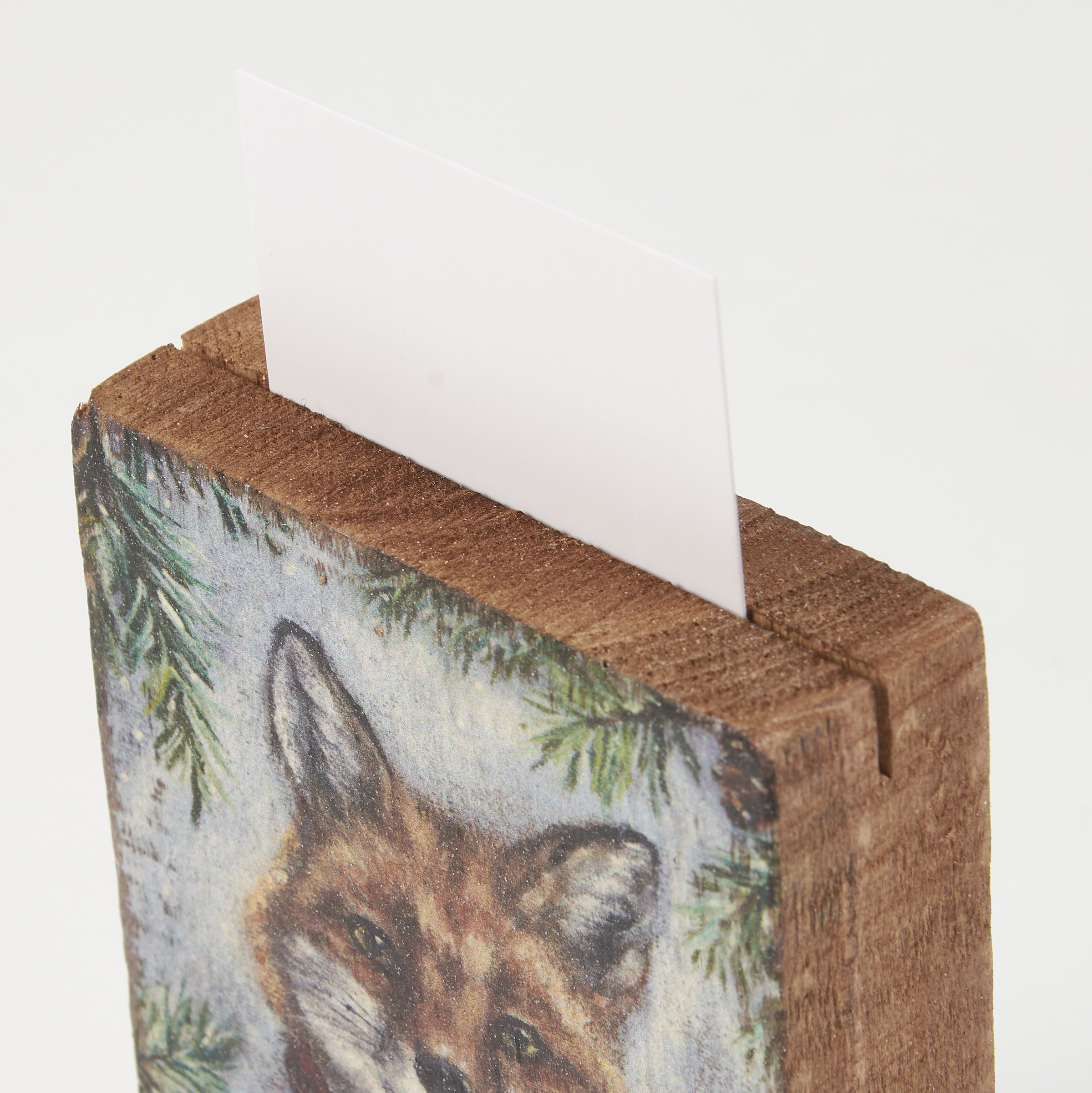A set of six wooden place card holders from our Christmas Collection displaying charming scenes of woodland animals wearing winter accessories on each. Holders feature individual designs of a raccoon, squirrel, fox, cardinal, bunny, and deer with coordinating natural wood on sides and backs. Designs are replicated from original artwork painted onto burlap canvas, giving the art a unique depth and texture. Our Winter Animals place card holder set can free-stand on flat surface and features slots on top that hold customized place cards. Set includes 24 place cards to customize. Seasonal place card holders are packaged together in a cardboard box displaying designs through acrylic lid and tied with cotton tape. A rustic set of tabletop accessories perfect for customizing seasonal place settings.