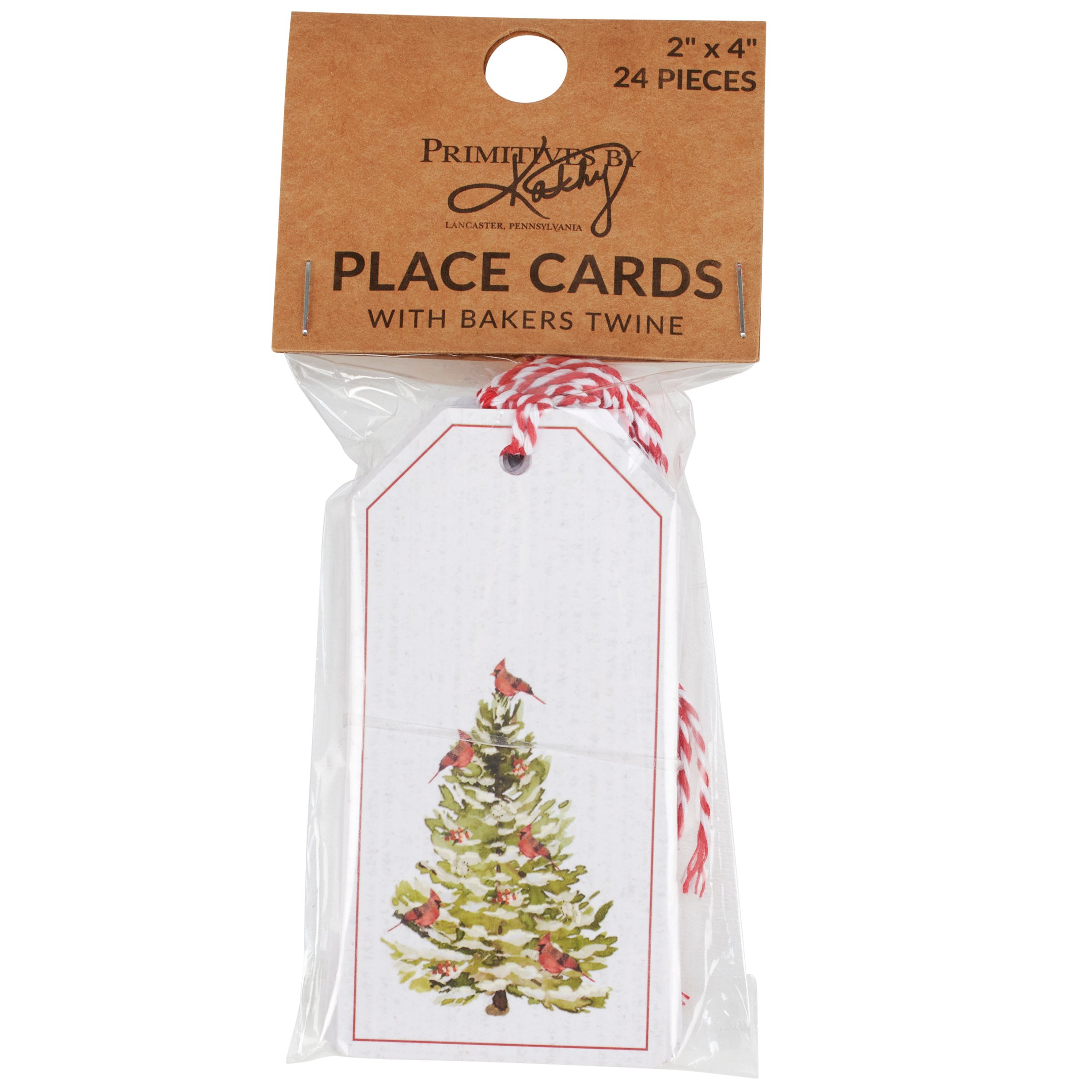 A set of 24 paper place cards from our Christmas Collection displaying a hand painted design of a winter tree with cardinals on a gift tag shaped card. Our Trees place cards each include an attached piece of red and white twine to easily be tied around rolled napkin or piece of table décor for display. Cards are packaged together in a poly bag with attached header card. A charming set of tabletop accessories perfect for customizing seasonal place settings.