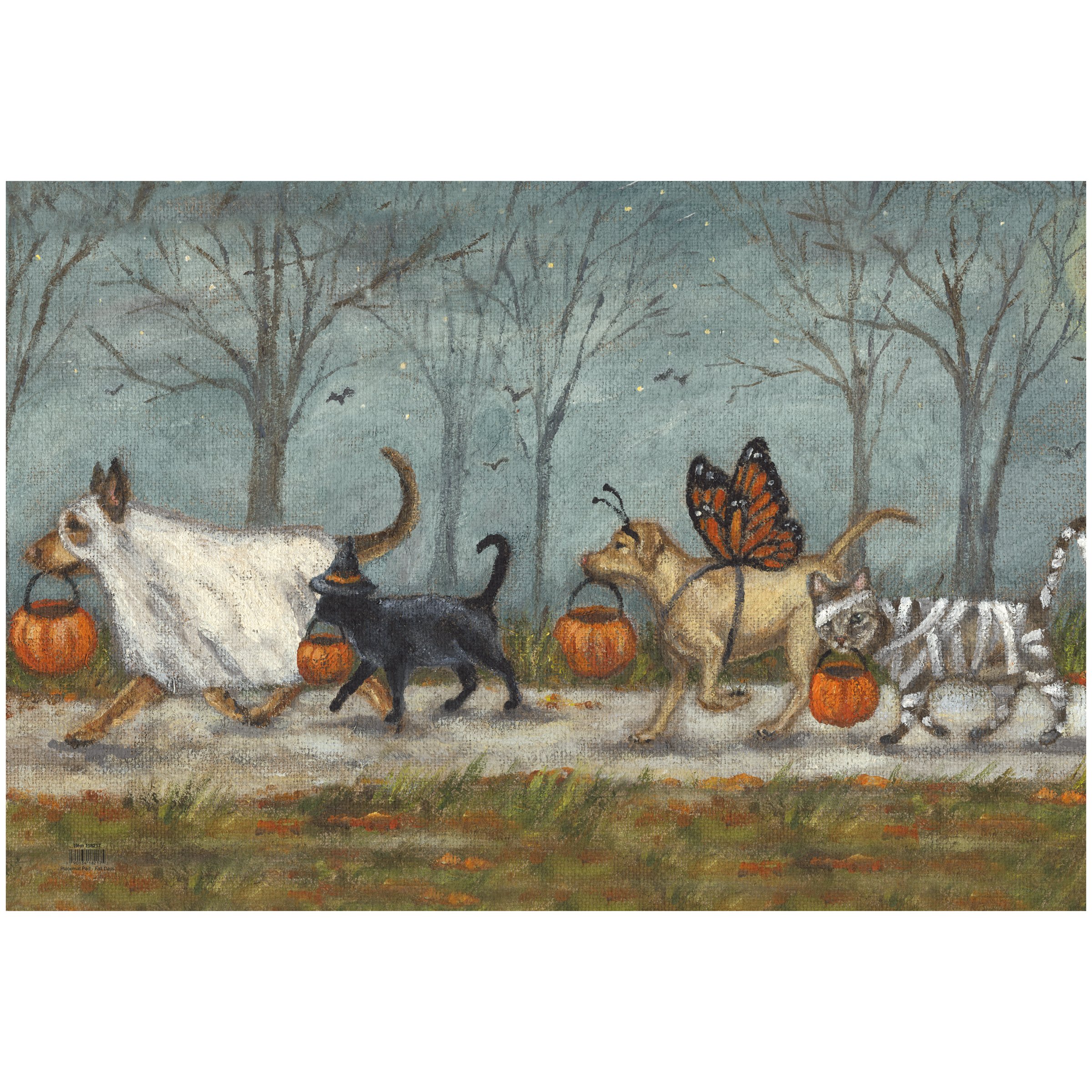 Great for customizing place settings and making clean-up a breeze, these paper placemat pads from our Halloween Collection display a hand painted design of pets in various Halloween costumes walking together holding treat buckets. Design is replicated from original artwork painted onto burlap canvas, giving the art a unique depth and texture. Our Spooky Pet Parade placemat pads are shrink-wrapped for protection as well as easy storage and shelf display. Each pack includes 24 single-use, tear-off placemats. A fun tabletop accessory perfect for customizing seasonal place settings.