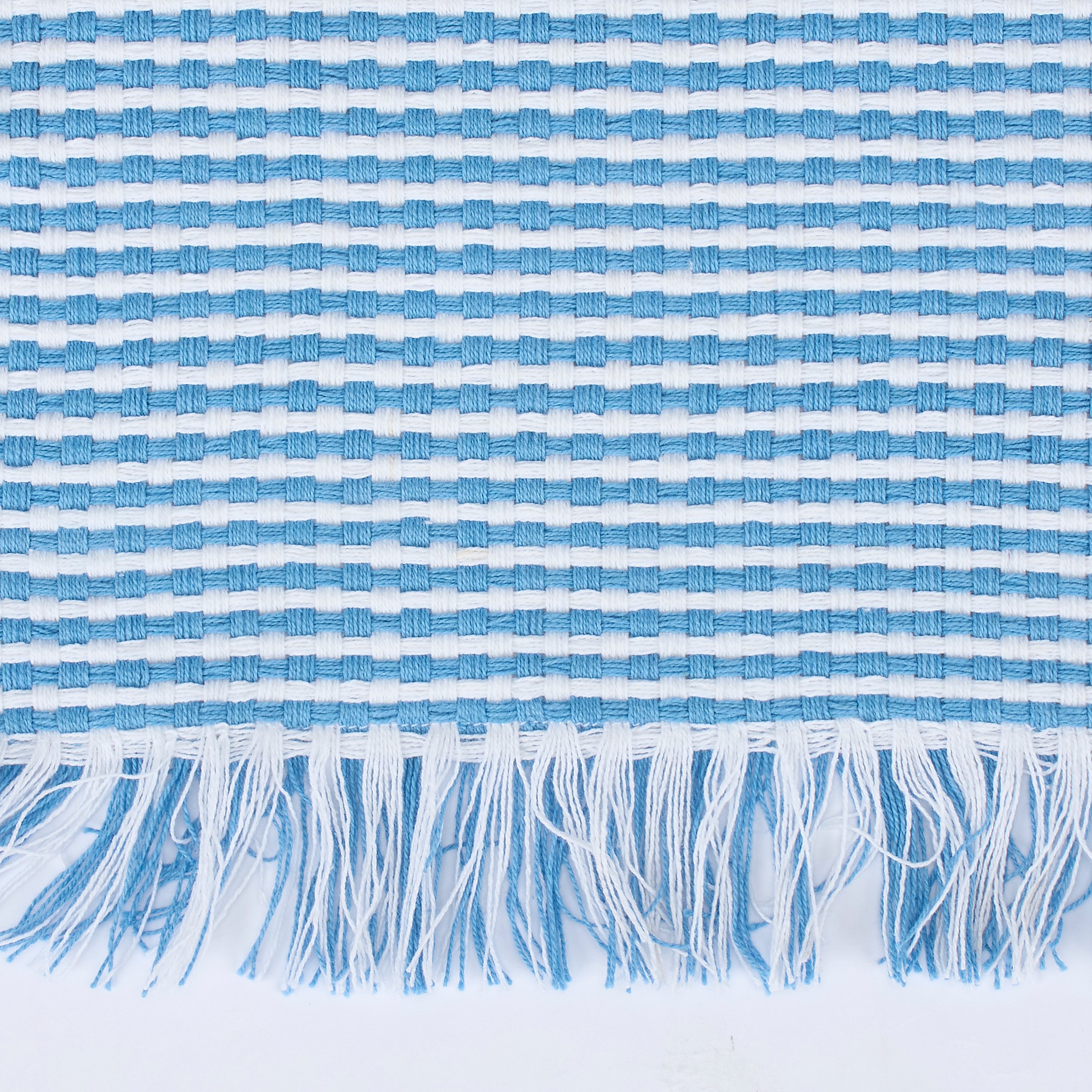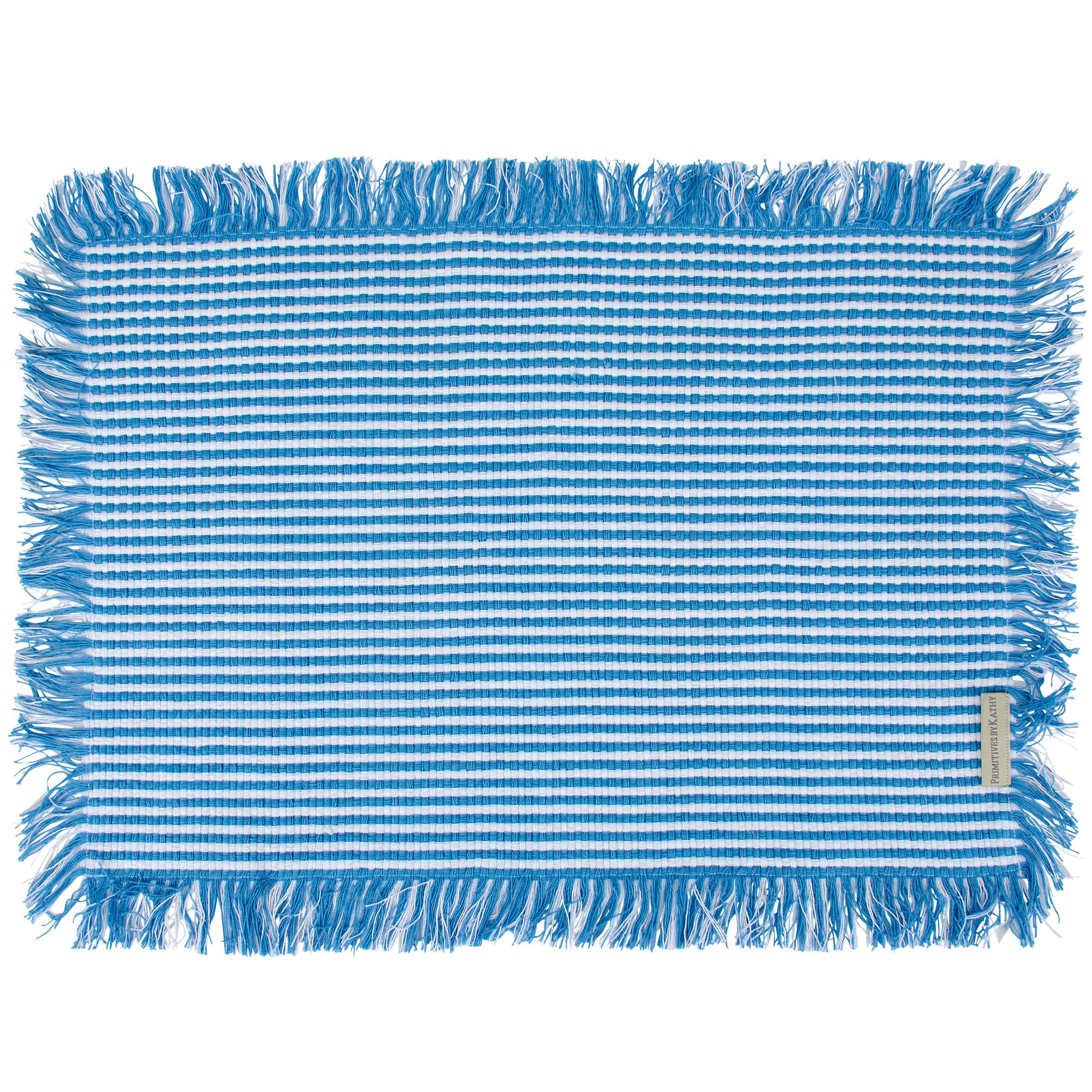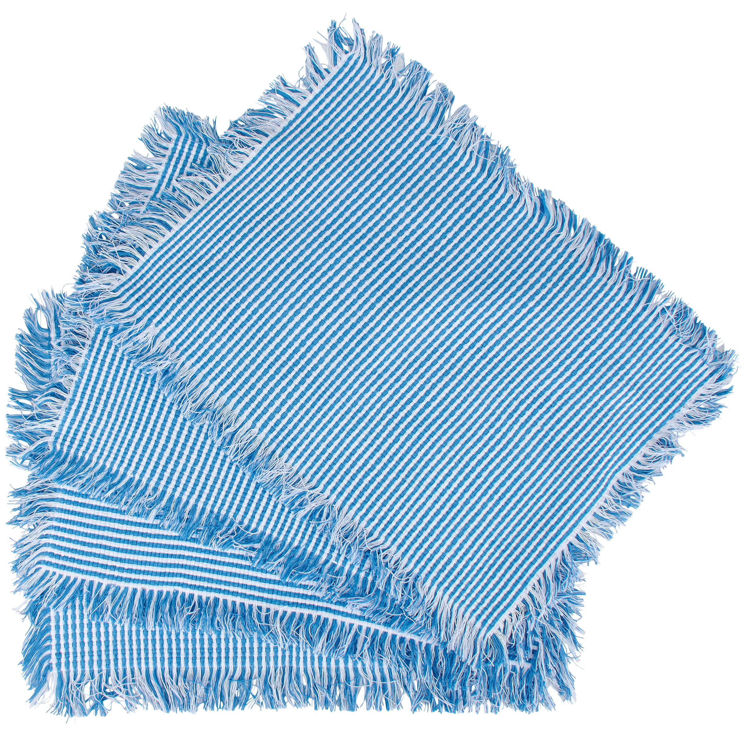 A set of 4 reusable cotton placemats from our Patriotic Collection featuring double-sided designs displaying American flag inspired blue stripes with fringe trims. Each patriotic placemat measures 19 inches by 13 inches for plenty of coverage when customizing place settings. Our Blue Stripe placemat set is conveniently machine-washable for easy cleaning. A set of rustic tabletop accessories perfect for 4th of July and Memorial Day decorating or celebrating stars and stripes all year round.