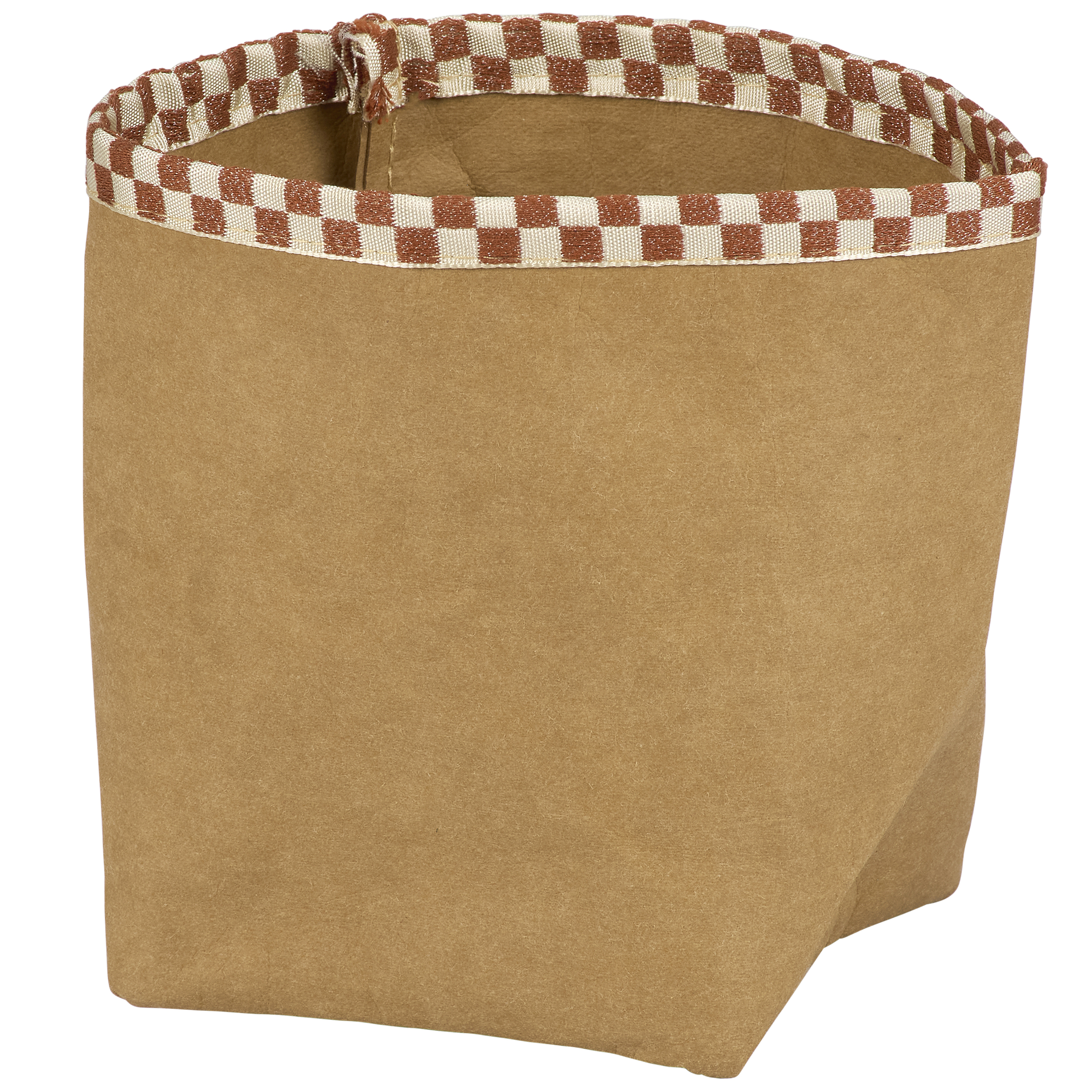 A small sturdy paper plant cover from our Western Collection displaying a paper bag inspired design with coordinating check fabric trim. Our small Paper Bag plant cover features opening on top to place plants or small décor. Greenery pictured not included. A western inspired plant accessory with a variety of display options.