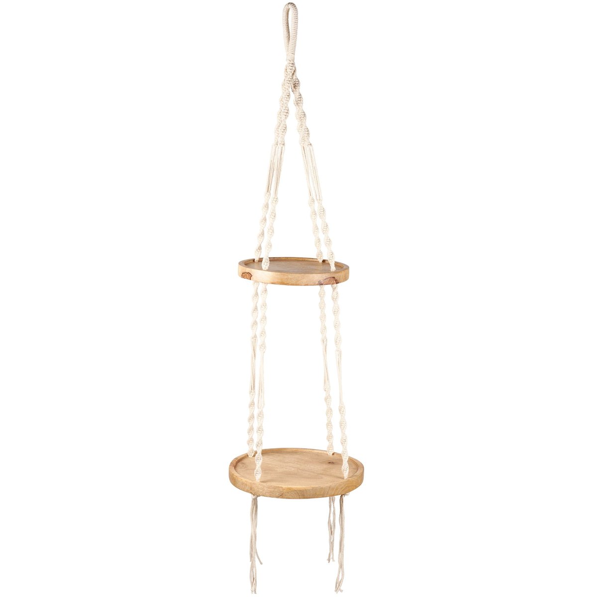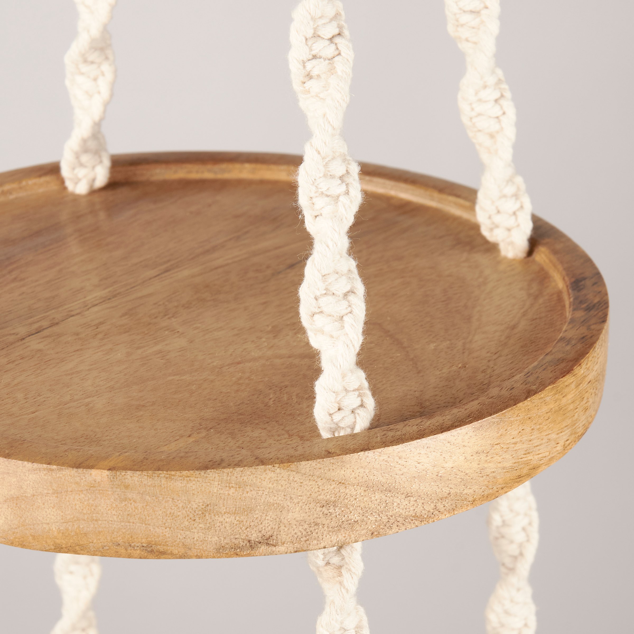 A plant hanger from our Botanical Collection made with cotton rope and natural wood in a simple design. Planter features two tiers to place potted plants on the round wooden shelves. Accessories and greenery pictured not included. Our Tiered Shelf plant hanger is easy to hang via tied loop. A natural plant accessory perfect for gifting to any plant parent.