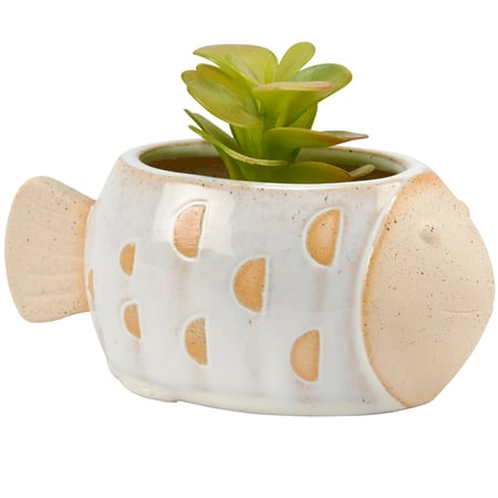 A ceramic pot from our Beach Collection displaying a sculpted flounder shape with cream glaze accents on raw ceramic. Our Flounder pot includes an opening on top to place florals, succulents, or décor. Greenery pictured not included. A fun beach-themed home accent perfect for everyday display.
