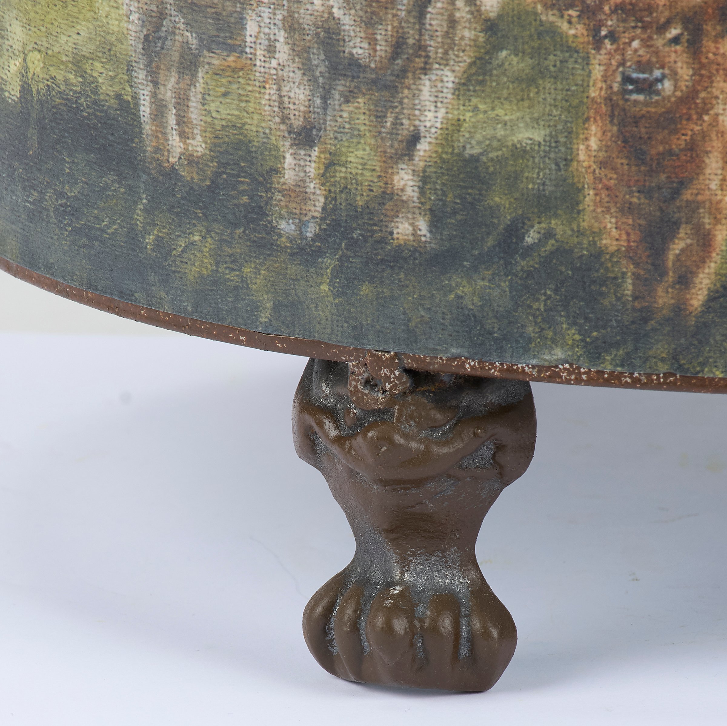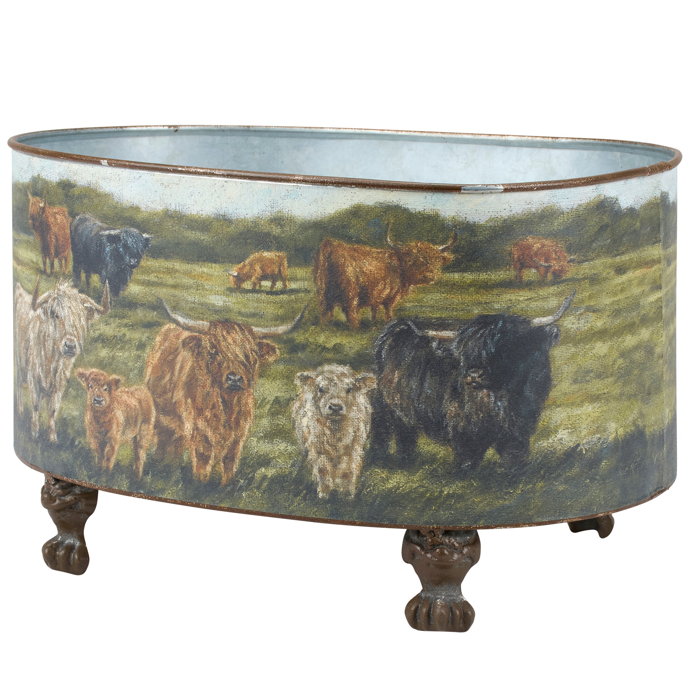 A metal planter from our Farmhouse Collection featuring a double-sided design displaying a charming farm scene of highland cows in a field replicated from original artwork painted onto burlap canvas, giving the art a unique depth and texture. Rustic planter stands on a clawfoot base and features a rust finish accents for an aged appearance. Our Highlands planter is designed to free stand on flat surface for display and is perfect for placing plants or household items. Accessories pictured not included. A farm themed home accent perfect for adding rustic style to home decor.