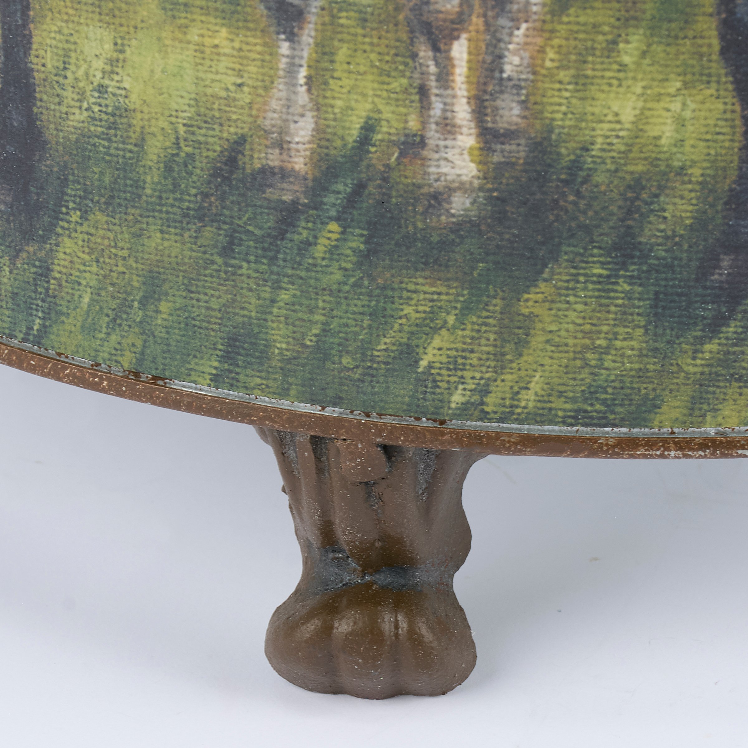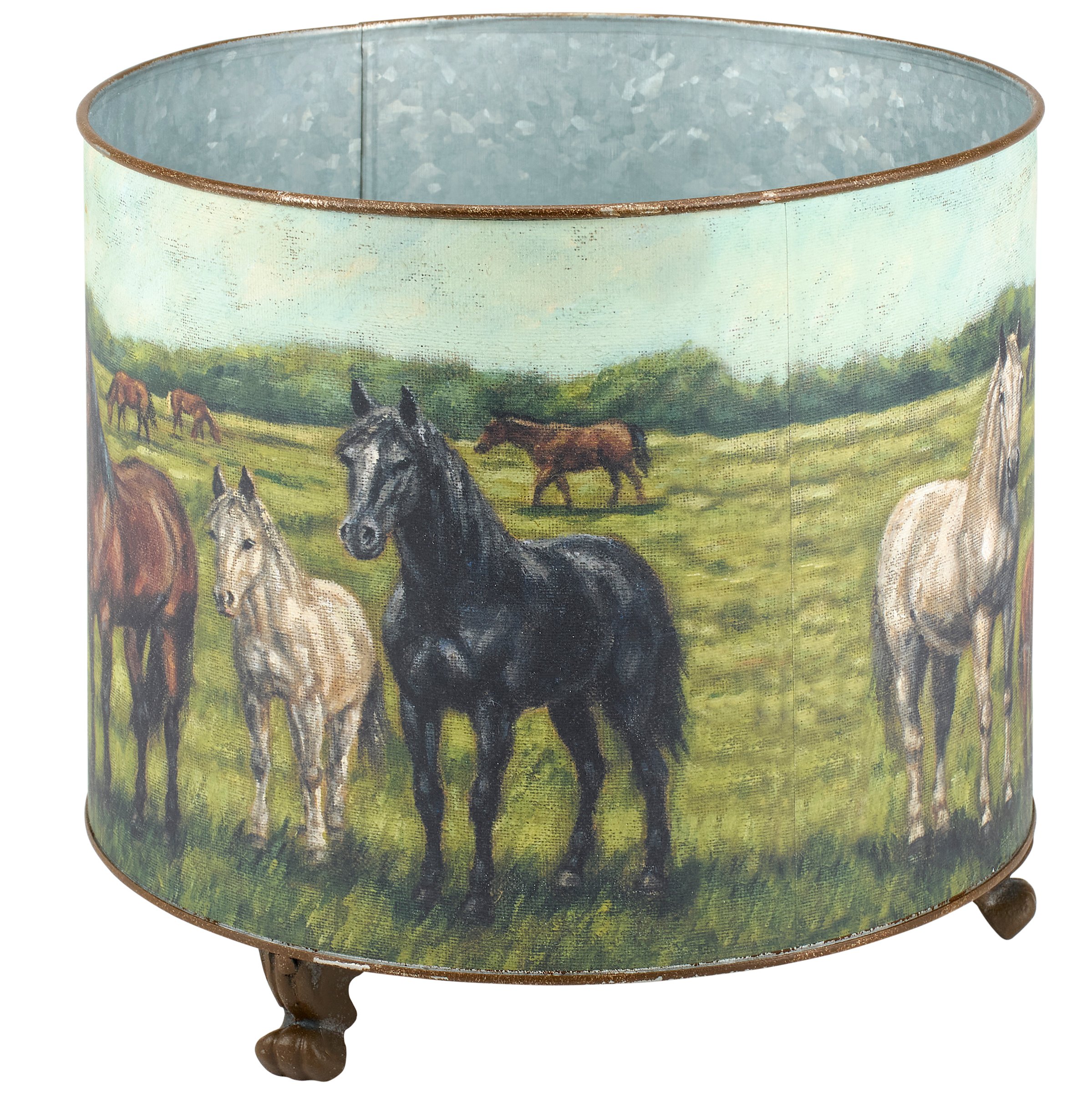 A metal planter from our Western Collection featuring a double-sided design displaying a charming scene of a family of horses in a field replicated from original artwork painted onto burlap canvas, giving the art a unique depth and texture. Rustic planter stands on a clawfoot base and features a rust finish accents for an aged appearance. Our Horse Family planter is designed to free stand on flat surface for display and is perfect for placing plants or household items. Accessories pictured not included. A horse themed home accent perfect for adding western style to home decor.