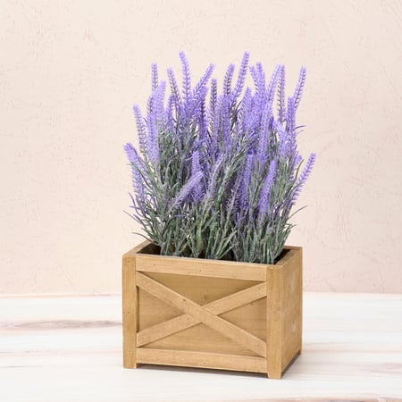 A small planter from our Botanical Collection featuring a delightful lavender plant in a wooden box. Faux plants bring botanical vibes to any space with zero maintenance. Our Lavender planter complements well with coordinating pieces in collection for a charming display. Complete as shown.