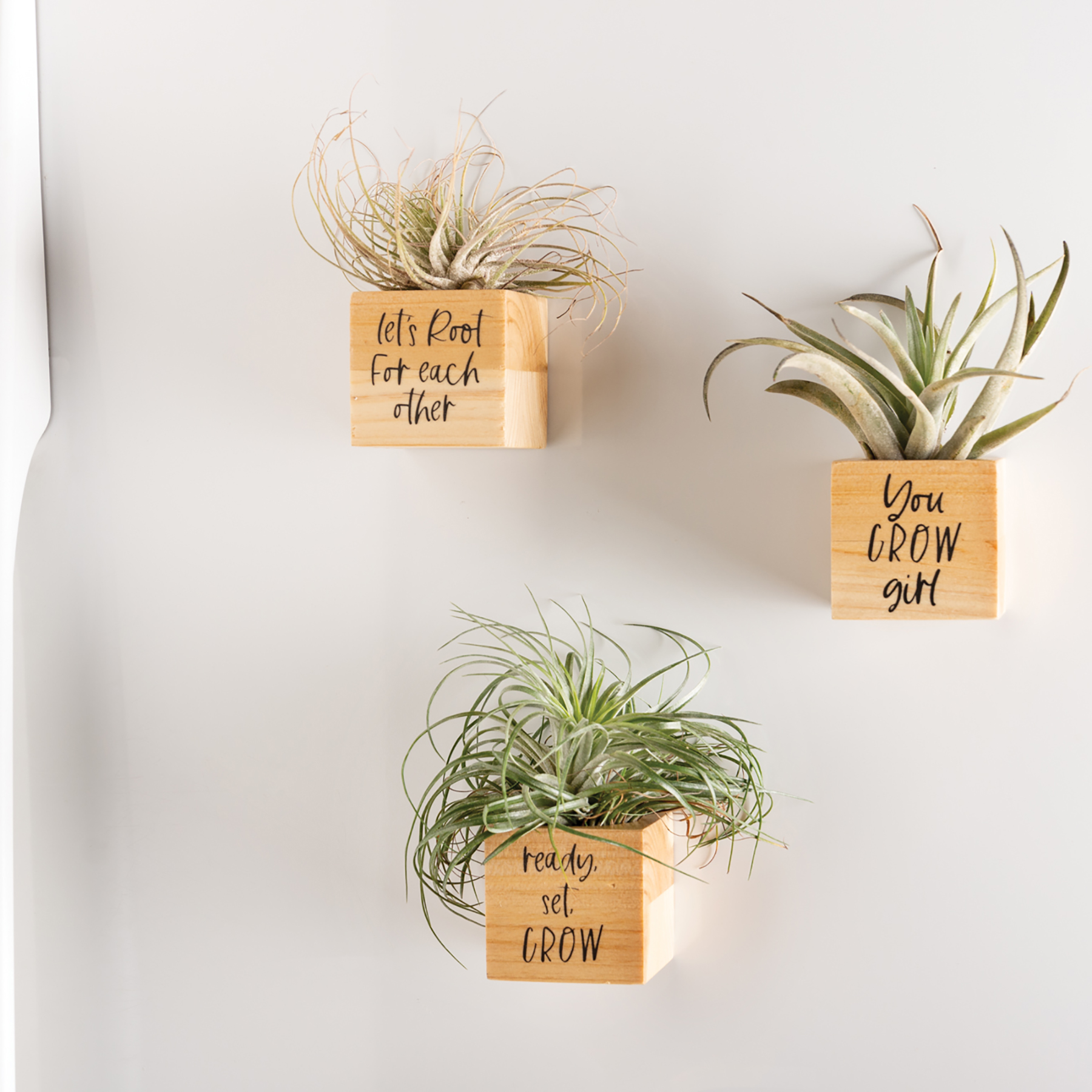 A set of three wooden planter magnets designed to hold small air plants. Magnets feature hand lettered "Let's Root For Each Other," "You Grow Girl," and "Ready, Set, Grow" sentiments. Planter magnets are packaged on a galvanized metal backer card with a cutout to easily hang on a rack. This house plant home decor is perfect for any space.