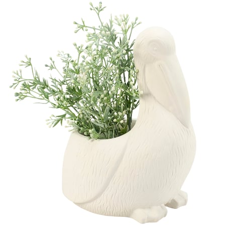 A cement planter from our Beach Collection displaying a pelican design with a cream finish and sculpted details. Our Pelican planter features opening on its back to place plants or small décor. Greenery pictured not included. A beach-themed plant accessory with a variety of display options.