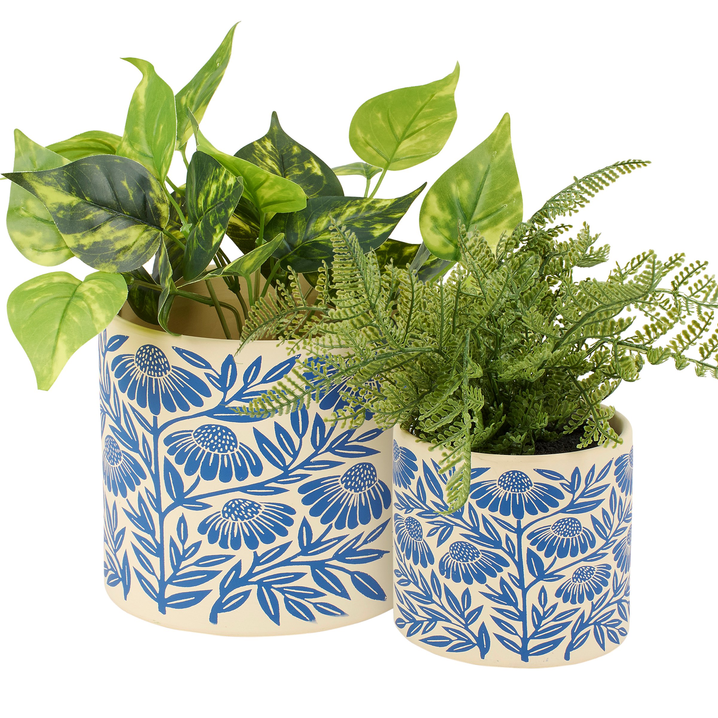 A set of terracotta planters from our Primitive Collection displaying folk art inspired patterns of blue florals around the outside each planter. Planter set includes 2 planters in different sizes that nest inside each other for compact storage. Our Blue Folk Art planter set features openings on top to place greenery or décor. Greenery pictured not included. A set of folk art themed plant accessories with a variety of display options.